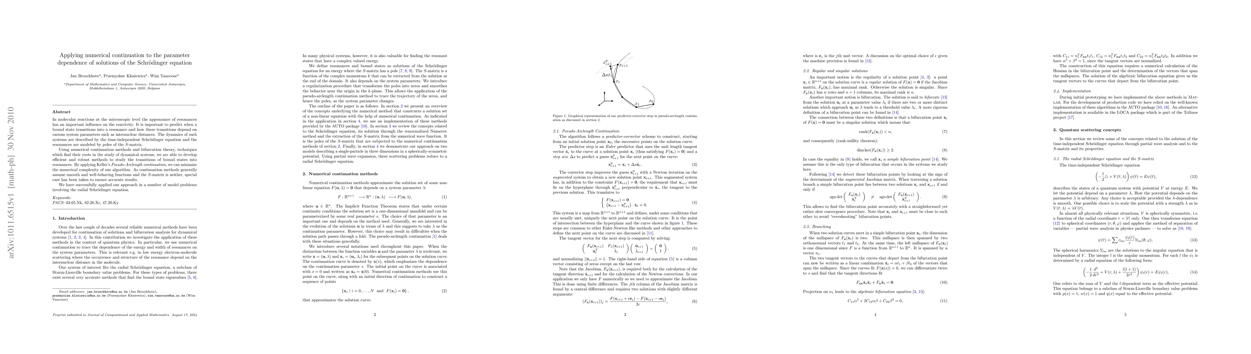 This paper develops numerical continuation techniques to study transitions of bound states into resonances in molecular reactions, focusing on the parameter dependence of solutions to the Schrödinger equation. By employing Keller's Pseudo-Arclength continuation and bifurcation theory, the authors create robust methods to accurately model these transitions, even when dealing with the non-smooth S-matrix.