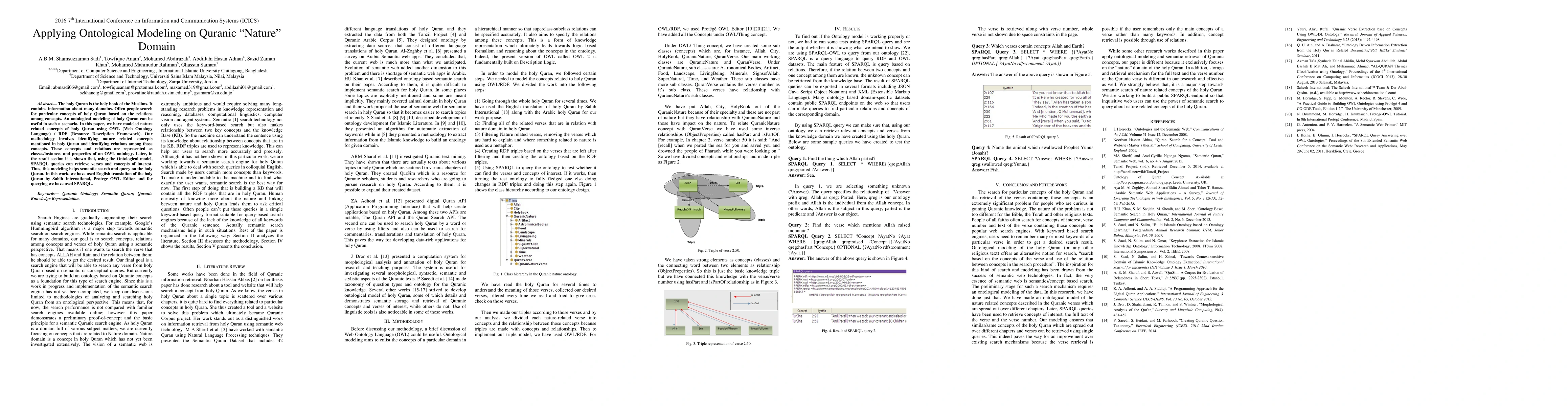 The holy Quran is the holy book of the Muslims. It contains information about many domains. Often people search for particular concepts of holy Quran based on the relations among concepts. An ontological modeling of holy Quran can be useful in such a scenario. In this paper, we have modeled nature related concepts of holy Quran using OWL (Web Ontology Language) / RDF (Resource Description Framework). Our methodology involves identifying nature related concepts mentioned in holy Quran and identifying relations among those concepts. These concepts and relations are represented as classes/instances and properties of an OWL ontology. Later, in the result section it is shown that, using the Ontological model, SPARQL queries can retrieve verses and concepts of interest. Thus, this modeling helps semantic search and query on the holy Quran. In this work, we have used English translation of the holy Quran by Sahih International, Protege OWL Editor and for querying we have used SPARQL.