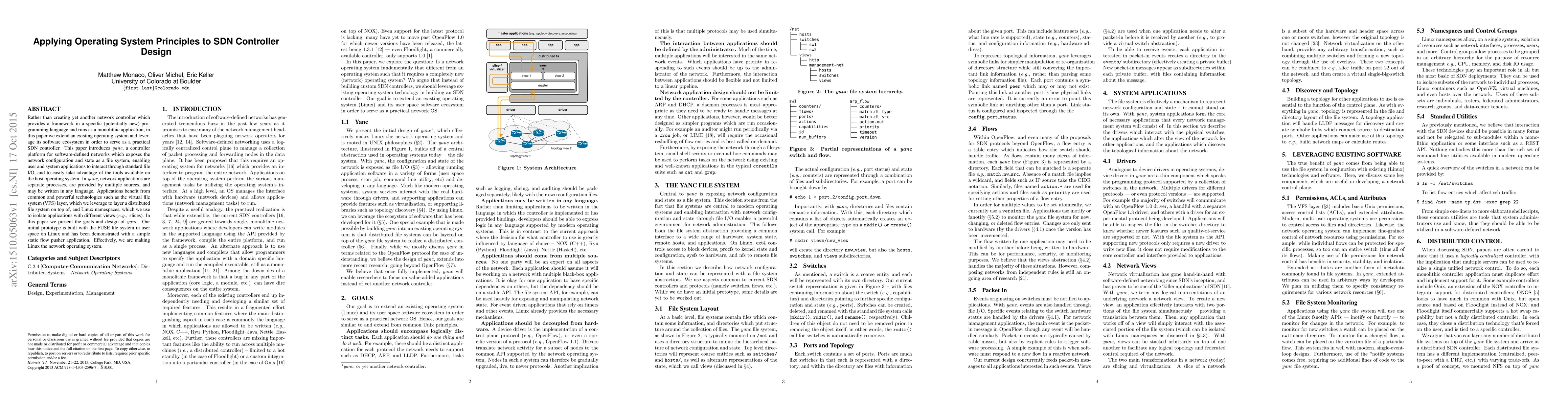 This paper proposes extending an existing operating system to design a SDN controller named yanc, which exposes network configurations as a file system. By leveraging the host OS's ecosystem, yanc allows network applications to interact via standard file I/O, benefiting from technologies like the VFS layer and Linux namespaces for isolation.