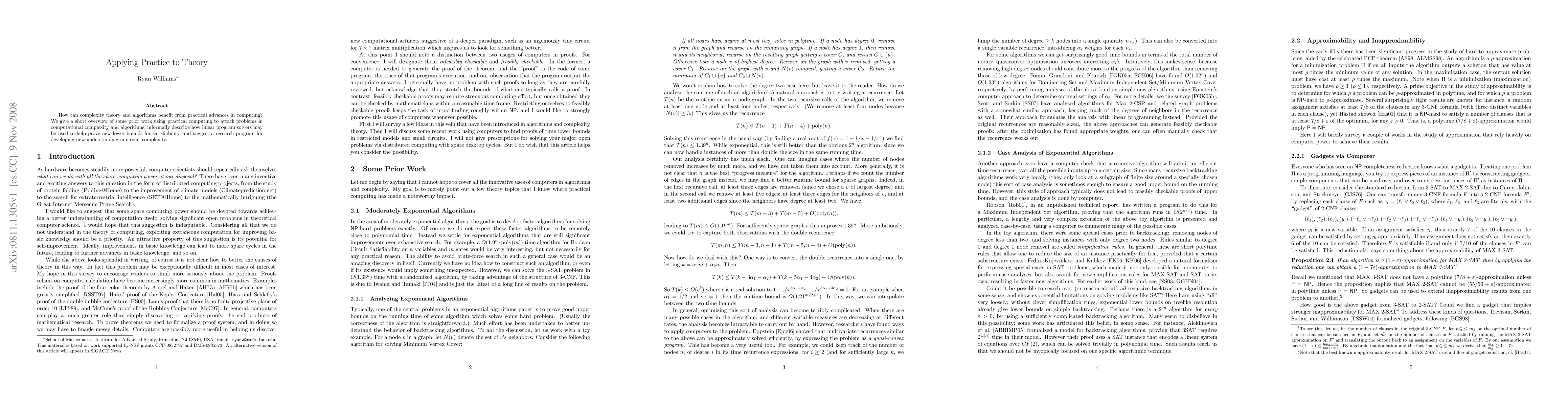 How can complexity theory and algorithms benefit from practical advances in computing? We give a short overview of some prior work using practical computing to attack problems in computational complexity and algorithms, informally describe how linear program solvers may be used to help prove new lower bounds for satisfiability, and suggest a research program for developing new understanding in circuit complexity.