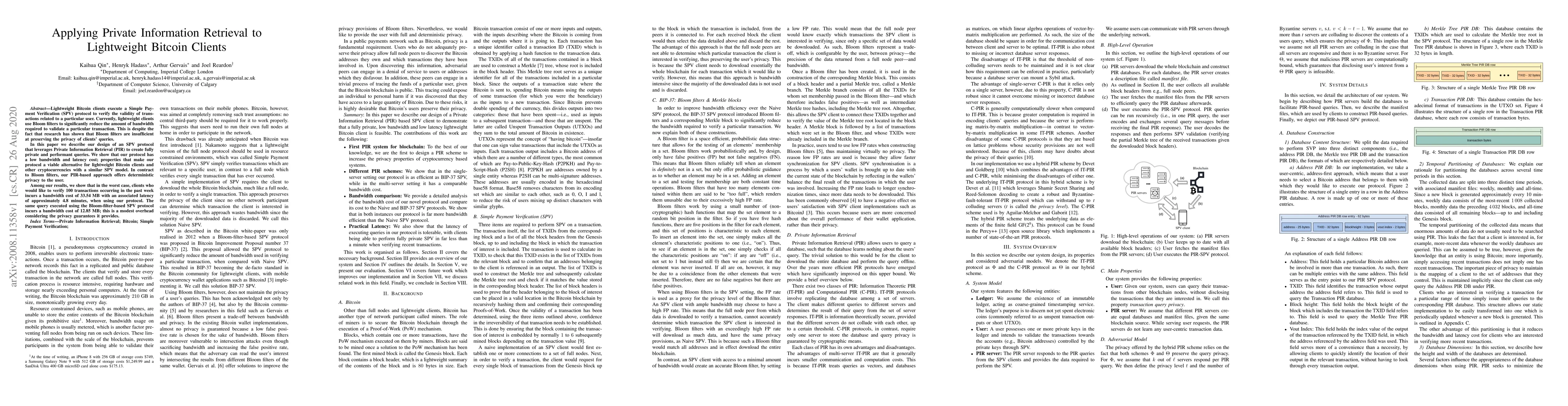 This paper proposes an SPV protocol for lightweight Bitcoin clients that utilizes Private Information Retrieval (PIR) to enhance privacy over traditional Bloom filters, achieving deterministic privacy with a modest increase in bandwidth and latency. The protocol incurs a bandwidth cost of 33.54 MB and a latency of approximately 4.8 minutes for verifying 100 transactions, compared to 12.85 MB for Bloom filters.