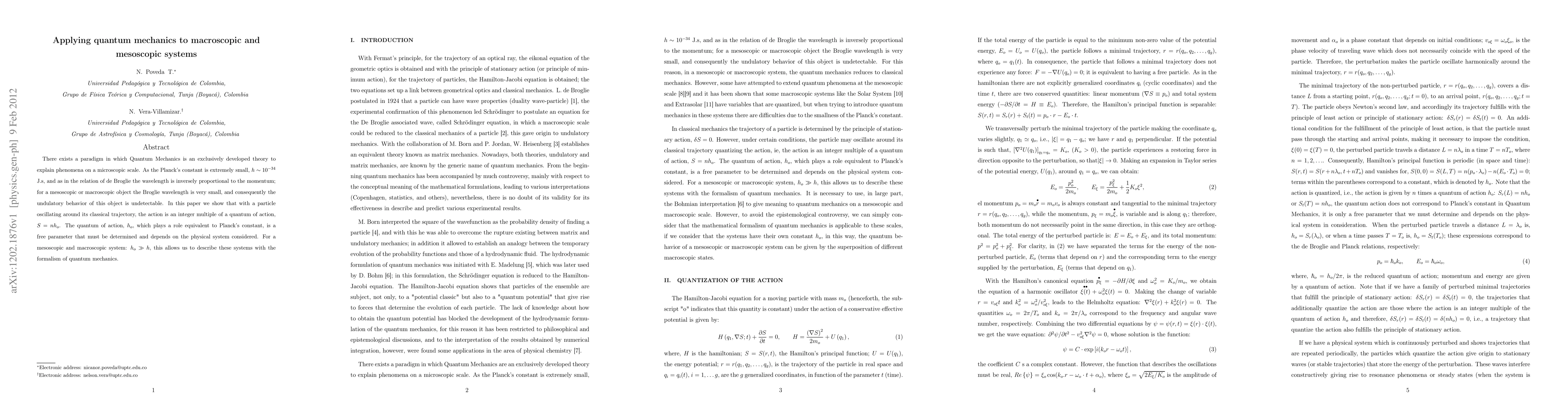 This paper explores applying quantum mechanics to mesoscopic and macroscopic systems, demonstrating that by introducing a quantum of action $h_{o}$ much larger than Planck's constant, quantum formalism can describe these larger-scale systems where traditional quantum effects are negligible.