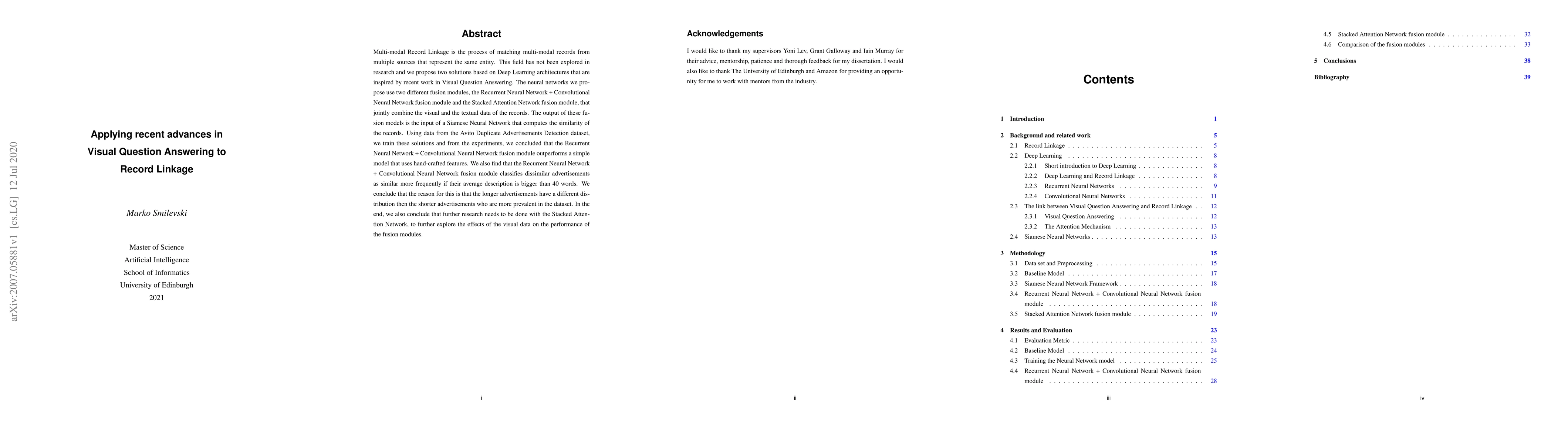 Multi-modal Record Linkage is the process of matching multi-modal records from multiple sources that represent the same entity. This field has not been explored in research and we propose two solutions based on Deep Learning architectures that are inspired by recent work in Visual Question Answering. The neural networks we propose use two different fusion modules, the Recurrent Neural Network + Convolutional Neural Network fusion module and the Stacked Attention Network fusion module, that jointly combine the visual and the textual data of the records. The output of these fusion models is the input of a Siamese Neural Network that computes the similarity of the records. Using data from the Avito Duplicate Advertisements Detection dataset, we train these solutions and from the experiments, we concluded that the Recurrent Neural Network + Convolutional Neural Network fusion module outperforms a simple model that uses hand-crafted features. We also find that the Recurrent Neural Network + Convolutional Neural Network fusion module classifies dissimilar advertisements as similar more frequently if their average description is bigger than 40 words. We conclude that the reason for this is that the longer advertisements have a different distribution then the shorter advertisements who are more prevalent in the dataset. In the end, we also conclude that further research needs to be done with the Stacked Attention Network, to further explore the effects of the visual data on the performance of the fusion modules.