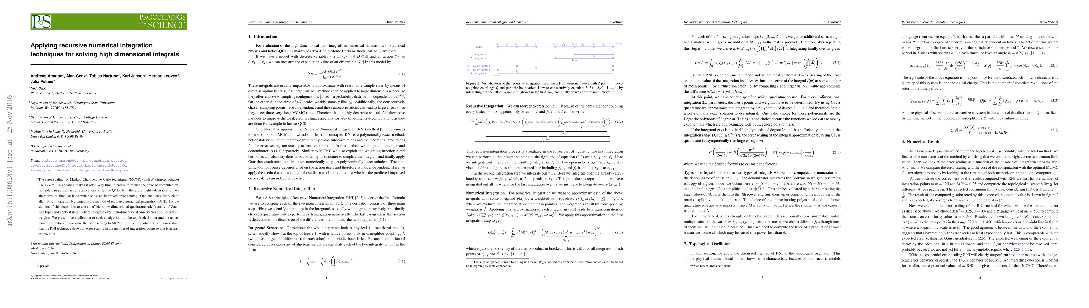 The error scaling for Markov-Chain Monte Carlo techniques (MCMC) with $N$ samples behaves like $1/\sqrt{N}$. This scaling makes it often very time intensive to reduce the error of computed observables, in particular for applications in lattice QCD. It is therefore highly desirable to have alternative methods at hand which show an improved error scaling. One candidate for such an alternative integration technique is the method of recursive numerical integration (RNI). The basic idea of this method is to use an efficient low-dimensional quadrature rule (usually of Gaussian type) and apply it iteratively to integrate over high-dimensional observables and Boltzmann weights. We present the application of such an algorithm to the topological rotor and the anharmonic oscillator and compare the error scaling to MCMC results. In particular, we demonstrate that the RNI technique shows an error scaling in the number of integration points $m$ that is at least exponential.