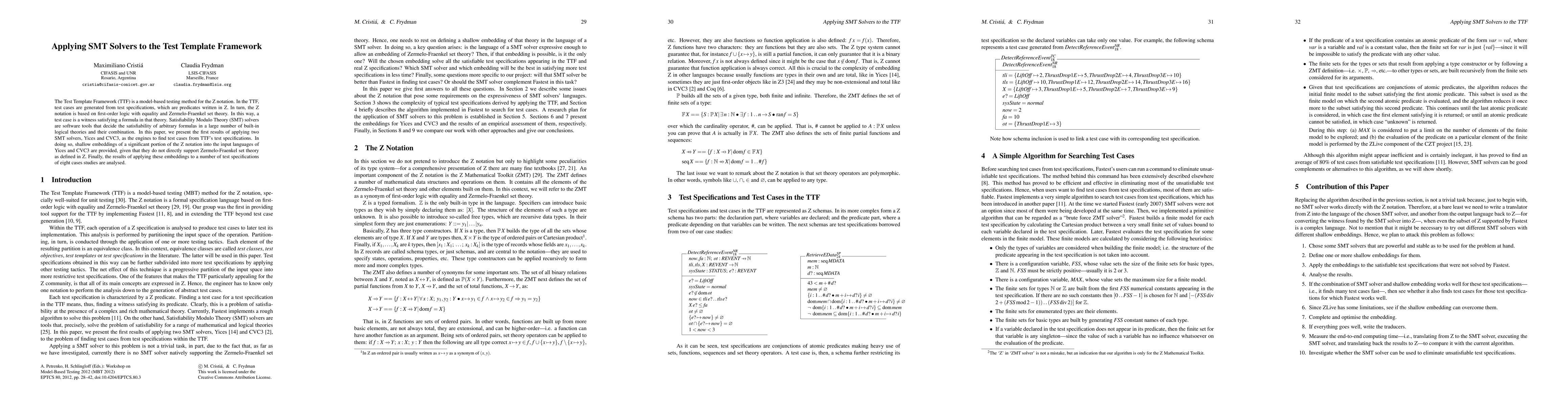 The Test Template Framework (TTF) is a model-based testing method for the Z notation. In the TTF, test cases are generated from test specifications, which are predicates written in Z. In turn, the Z notation is based on first-order logic with equality and Zermelo-Fraenkel set theory. In this way, a test case is a witness satisfying a formula in that theory. Satisfiability Modulo Theory (SMT) solvers are software tools that decide the satisfiability of arbitrary formulas in a large number of built-in logical theories and their combination. In this paper, we present the first results of applying two SMT solvers, Yices and CVC3, as the engines to find test cases from TTF's test specifications. In doing so, shallow embeddings of a significant portion of the Z notation into the input languages of Yices and CVC3 are provided, given that they do not directly support Zermelo-Fraenkel set theory as defined in Z. Finally, the results of applying these embeddings to a number of test specifications of eight cases studies are analysed.