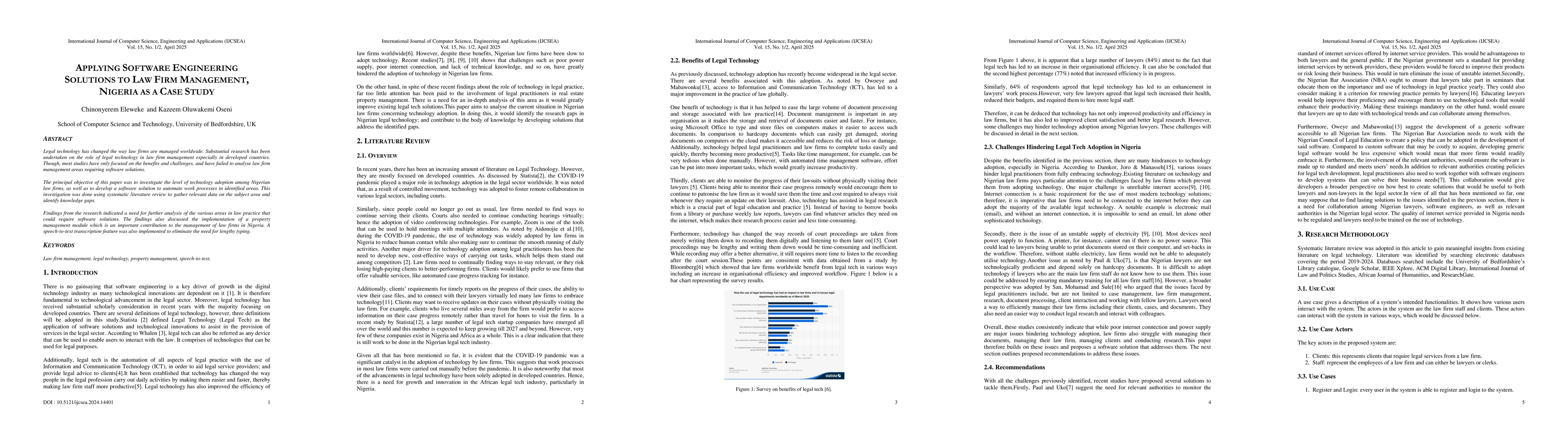 A study investigated the technology adoption among Nigerian law firms and developed software solutions to automate work processes, including a property management module and speech-to-text transcription feature.