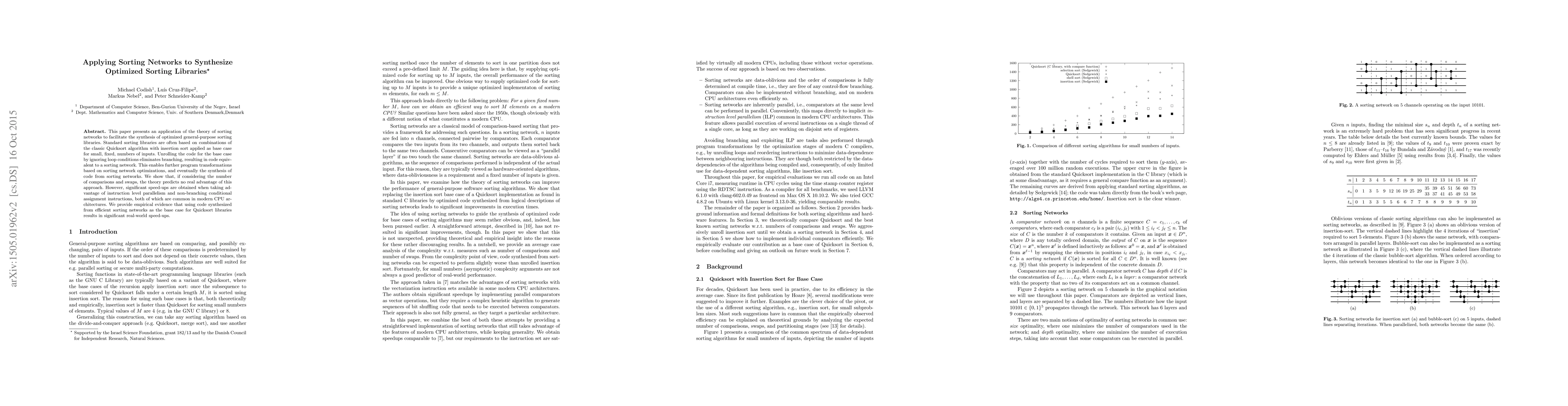 This paper applies sorting networks to create optimized general-purpose sorting libraries, demonstrating that synthesized code from sorting networks can significantly speed up sorting operations by leveraging instruction-level parallelism and non-branching instructions, despite no reduction in comparisons or swaps. Empirical results show notable real-world performance improvements.