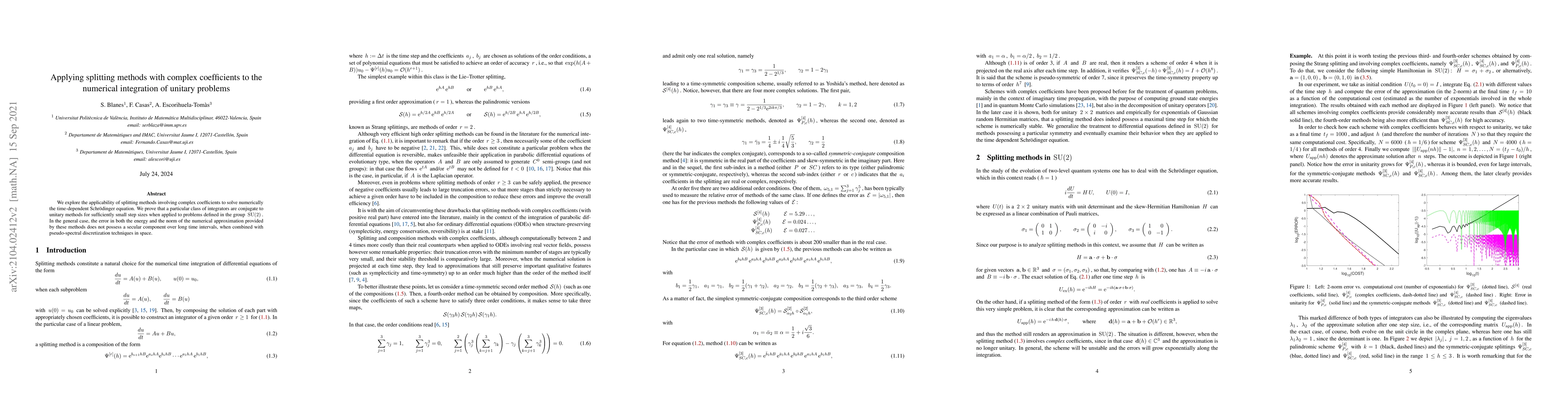 We explore the applicability of splitting methods involving complex coefficients to solve numerically the time-dependent Schr\"odinger equation. We prove that a particular class of integrators are conjugate to unitary methods for sufficiently small step sizes when applied to problems defined in the group $\mathrm{SU}(2)$. In the general case, the error in both the energy and the norm of the numerical approximation provided by these methods does not possess a secular component over long time intervals, when combined with pseudo-spectral discretization techniques in space.