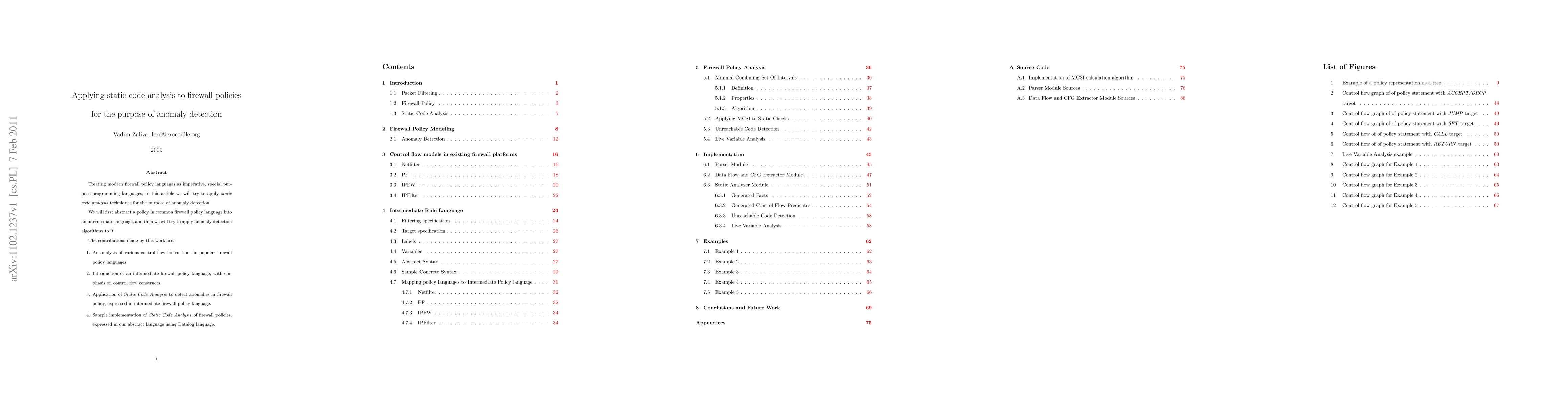 This paper explores applying static code analysis techniques to firewall policies by treating them as special purpose programming languages. It introduces an intermediate language for firewall policies and uses it to implement static code analysis for anomaly detection, contributing an analysis of control flow, a new intermediate language, and a Datalog-based implementation.