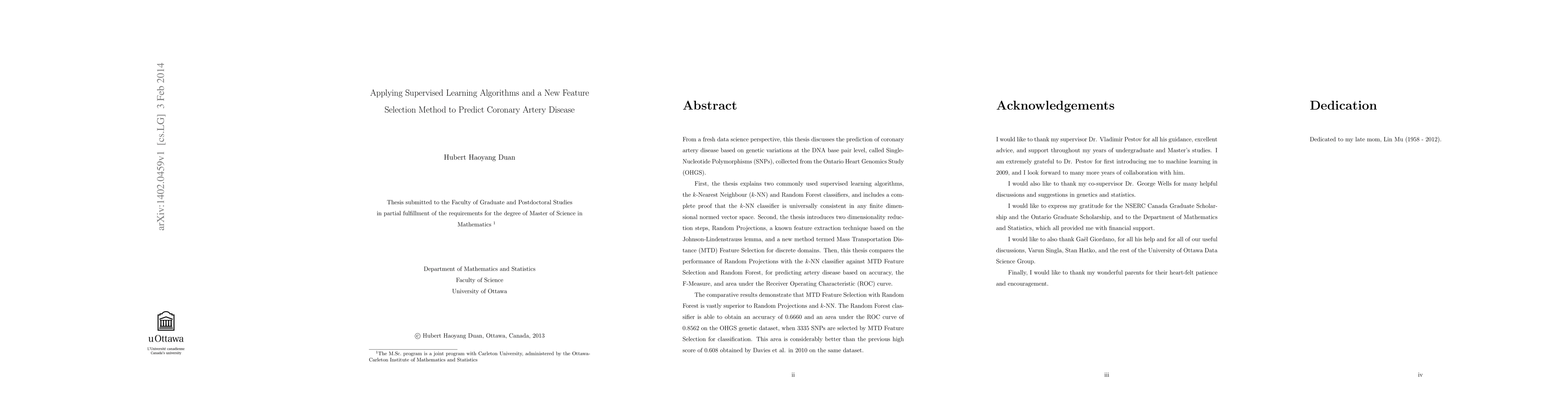This research applies supervised learning algorithms and a novel feature selection method to predict coronary artery disease using genetic data from the Ontario Heart Genomics Study. The study finds that the Random Forest classifier combined with Mass Transportation Distance Feature Selection outperforms other methods, achieving an accuracy of 0.6660 and an area under the ROC curve of 0.8562, surpassing previous results.