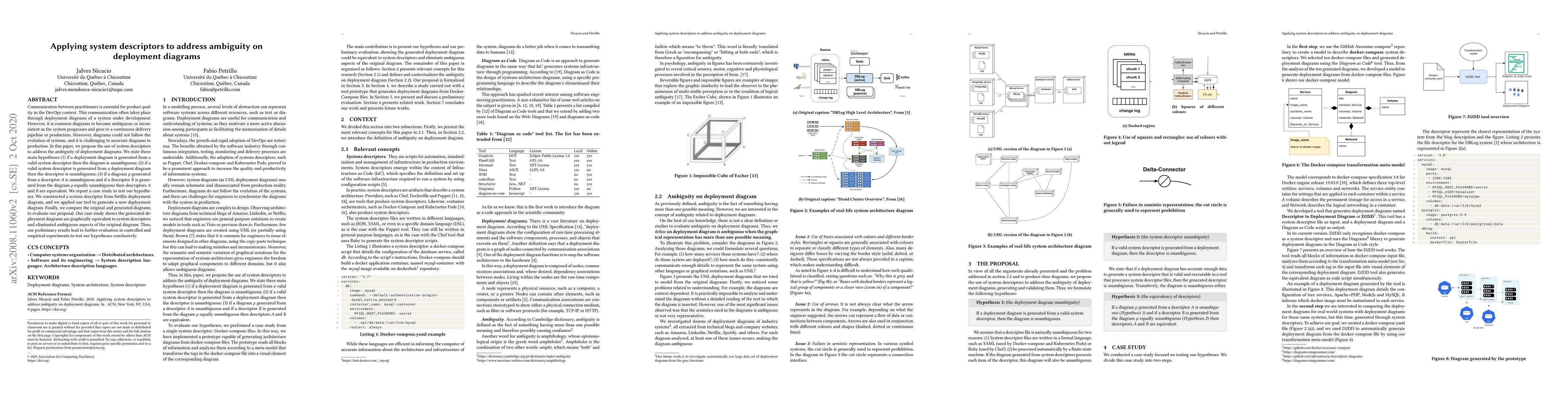 This paper proposes using system descriptors to reduce ambiguity in deployment diagrams used in DevOps communication. The study hypothesizes that unambiguous diagrams and descriptors can be generated from each other and that equivalent descriptors result from equivalent diagrams. A case study with Netflix's deployment diagram shows promising results in eliminating ambiguities, suggesting further empirical testing is needed.