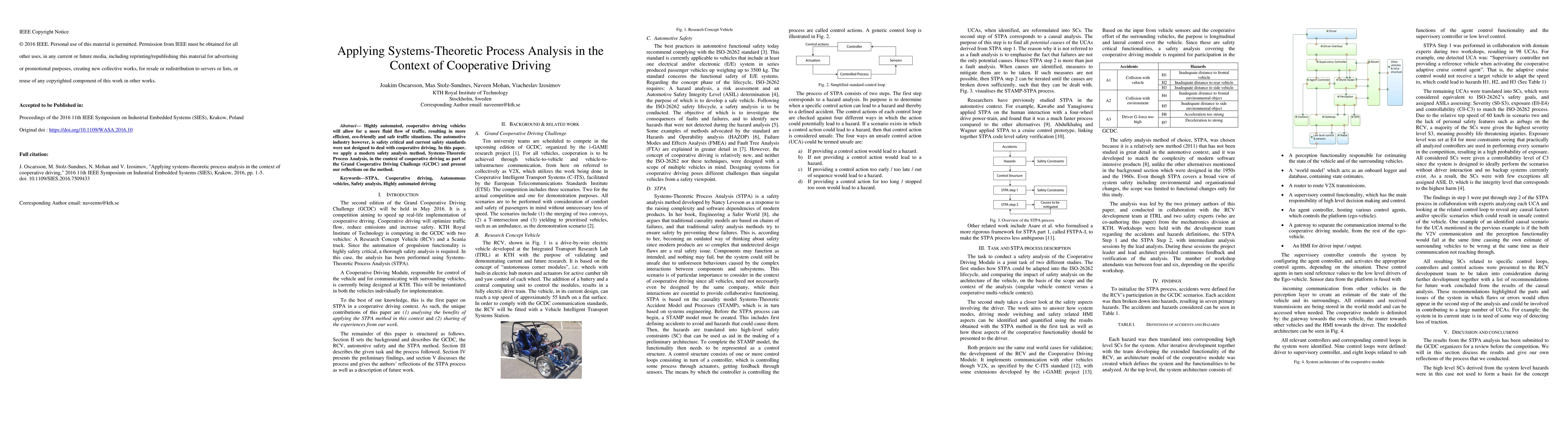 Highly automated, cooperative driving vehicles will allow for a more fluid flow of traffic, resulting in more efficient, eco-friendly and safe traffic situations. The automotive industry however, is safety critical and current safety standards were not designed to deal with cooperative driving. In this paper, we apply a modern safety analysis method, Systems-Theoretic Process Analysis, in the context of cooperative driving as part of the Grand Cooperative Driving Challenge (GCDC) and present our reflections on the method.