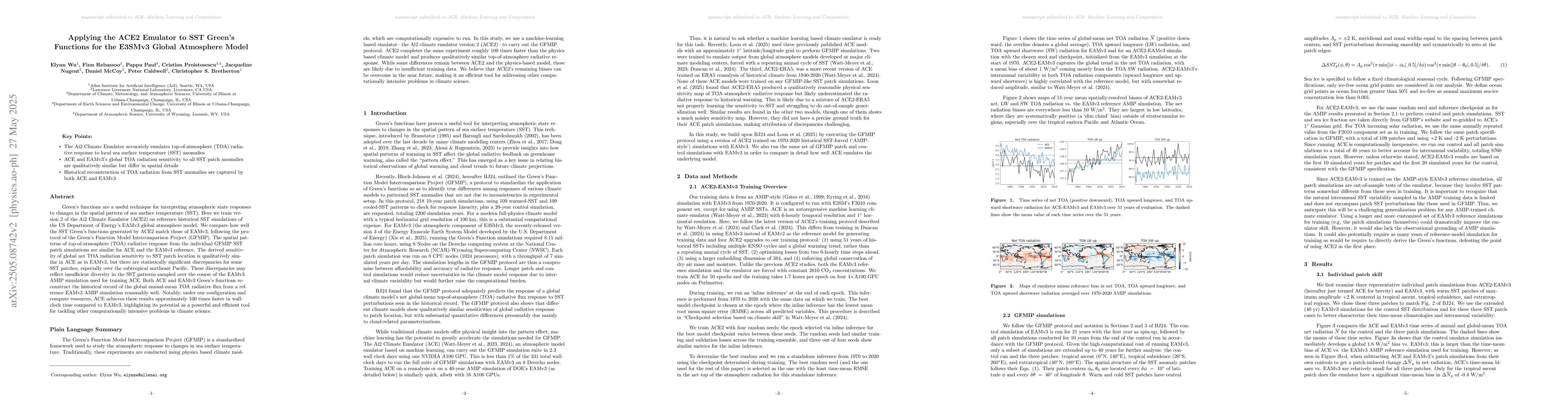 The research trains ACE2 emulator version 2 on historical SST simulations from EAMv3, comparing generated SST Green's functions with those from EAMv3 following GFMIP protocol.
