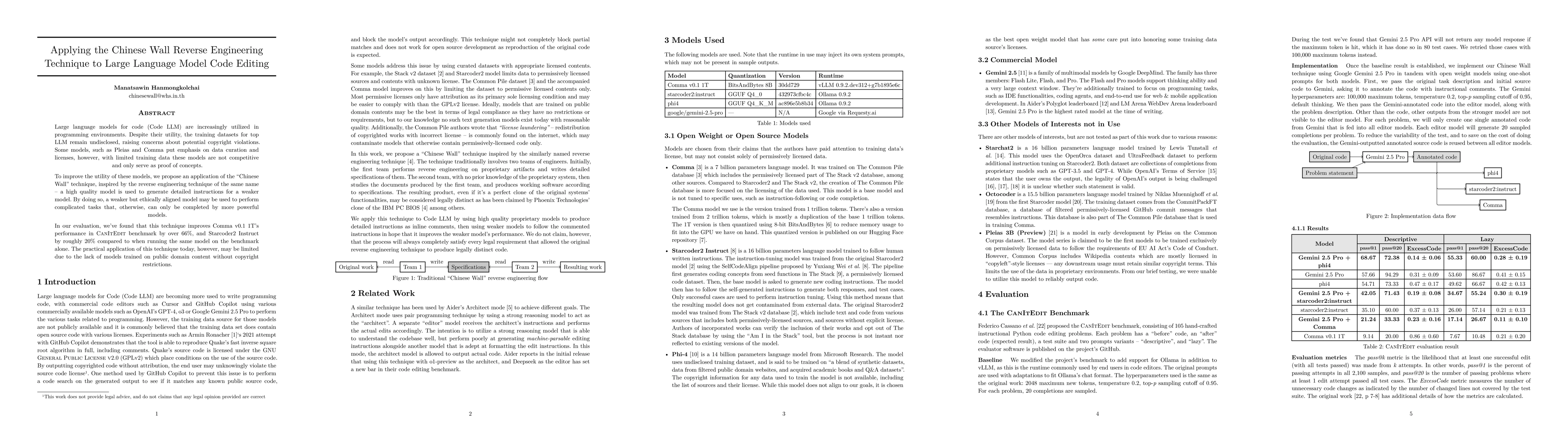 Large language models for code (Code LLM) are increasingly utilized in programming environments. Despite their utility, the training datasets for top LLM remain undisclosed, raising concerns about potential copyright violations. Some models, such as Pleias and Comma put emphasis on data curation and licenses, however, with limited training data these models are not competitive and only serve as proof of concepts. To improve the utility of these models, we propose an application of the "Chinese Wall" technique, inspired by the reverse engineering technique of the same name -- a high quality model is used to generate detailed instructions for a weaker model. By doing so, a weaker but ethically aligned model may be used to perform complicated tasks that, otherwise, can only be completed by more powerful models. In our evaluation, we've found that this technique improves Comma v0.1 1T's performance in CanItEdit benchmark by over 66%, and Starcoder2 Instruct by roughly 20% compared to when running the same model on the benchmark alone. The practical application of this technique today, however, may be limited due to the lack of models trained on public domain content without copyright restrictions.