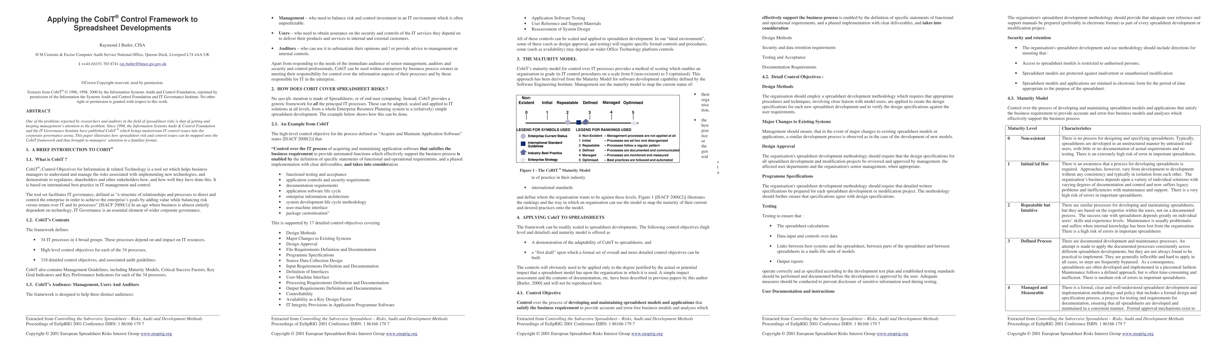 This paper explores how the CobiT control framework can be applied to enhance governance and control over spreadsheet developments, aiming to bring spreadsheet risk issues to management's attention through a familiar IT governance structure. The study demonstrates the mapping of spreadsheet risk and control issues onto the CobiT framework.