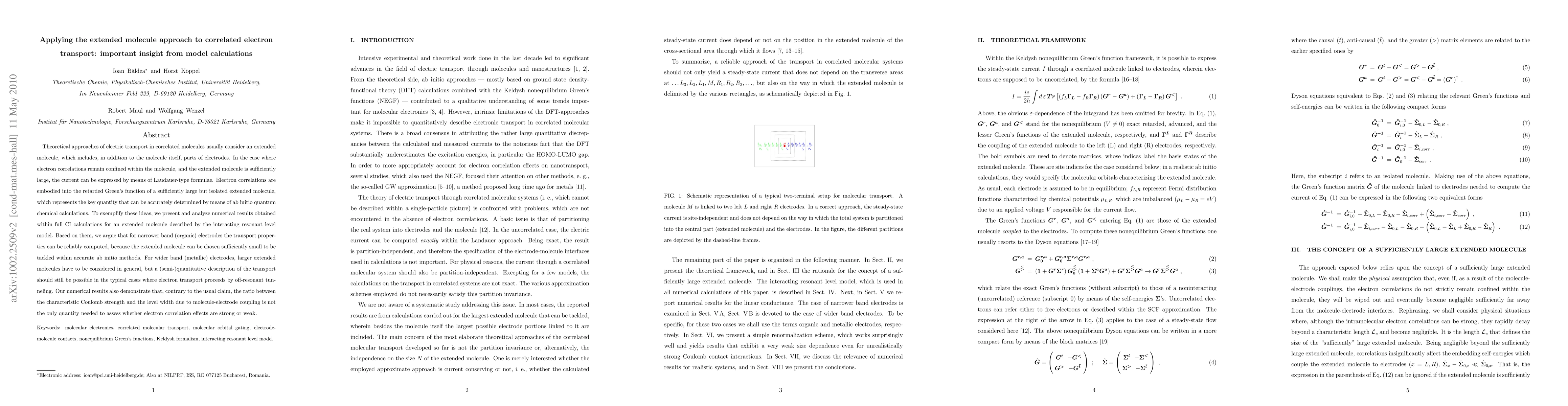 Theoretical approaches of electronic transport in correlated molecules usually consider an extended molecule, which includes, in addition to the molecule itself, parts of electrodes. In the case where electron correlations remain confined within the molecule, and the extended molecule is sufficiently large, the current can be expressed by means of Laudauer-type formulae. Electron correlations are embodied into the retarded Green function of a sufficiently large but isolated extended molecule, which represents the key quantity that can be accurately determined by means of ab initio quantum chemical calculations. To exemplify these ideas, we present and analyze numerical results obtained within full CI calculations for an extended molecule described by the interacting resonant level model. Based on them, we argue that for organic electrodes the transport properties can be reliably computed, because the extended molecule can be chosen sufficiently small to be tackled within accurate ab initio methods. For metallic electrodes, larger extended molecules have to be considered in general, but a (semi-)quantitative description of the transport should still be possible particularly in the typical cases where electron transport proceeds by off-resonant tunneling. Our numerical results also demonstrate that, contrary to the usual claim, the ratio between the characteristic Coulomb strength and the level width due to molecule-electrode coupling is not the only quantity needed to assess whether electron correlation effects are strong or weak.
