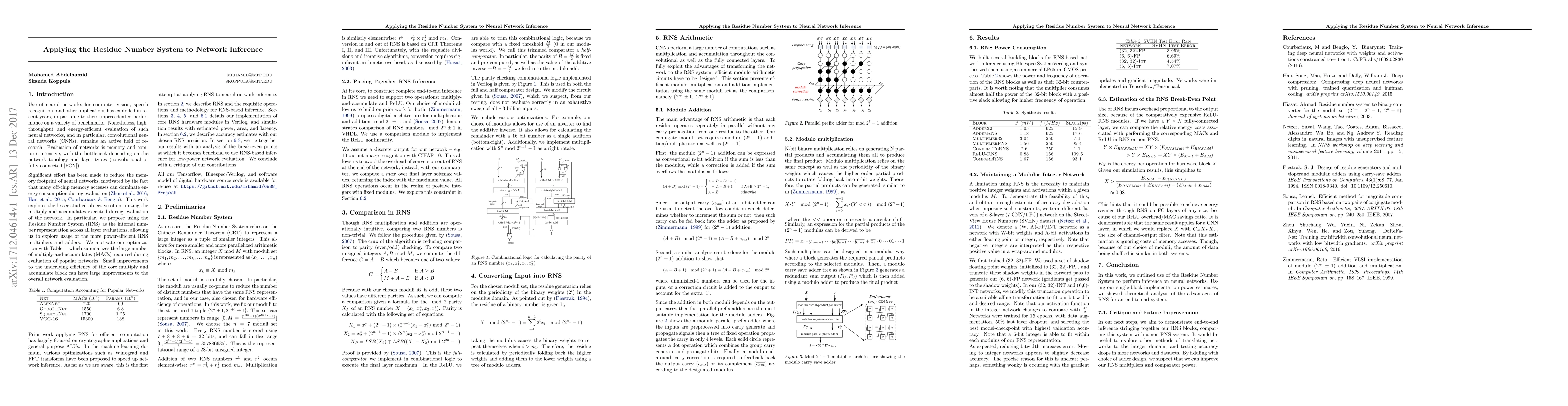 This work explores the lesser studied objective of optimizing the multiply-and-accumulates executed during evaluation of the network. In particular, we propose using the Residue Number System (RNS) as the internal number representation across all layer evaluations, allowing us to explore usage of the more power-efficient RNS multipliers and adders. Using results from simulation of our RNS arithmetic block implementations, we show theoretical power advantages of using RNS for an end-to-end evaluator.
