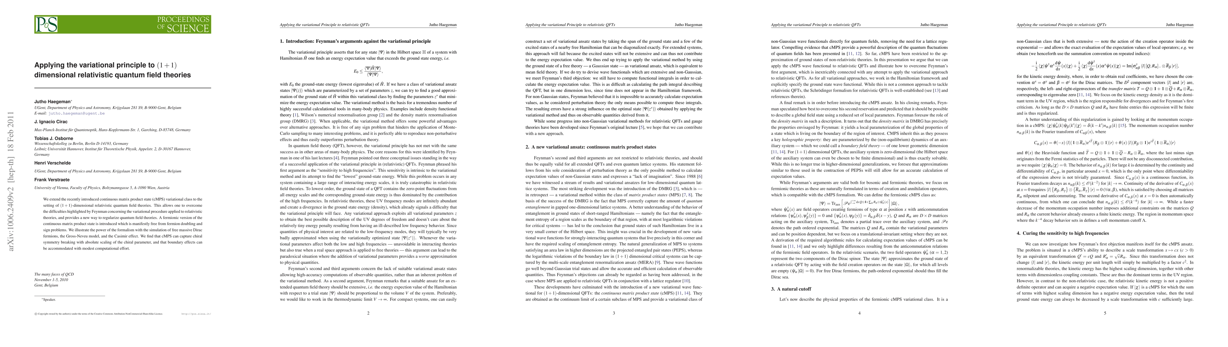 We extend the recently introduced continuous matrix product state (cMPS) variational class to the setting of (1+1)-dimensional relativistic quantum field theories. This allows one to overcome the difficulties highlighted by Feynman concerning the variational procedure applied to relativistic theories, and provides a new way to regularize quantum field theories. A fermionic version of the continuous matrix product state is introduced which is manifestly free from fermion doubling and sign problems. We illustrate the power of the formalism with the simulation of free massive Dirac fermions, the Gross-Neveu model, and the Casimir effect. We find that cMPS can capture chiral symmetry breaking with absolute scaling of the chiral parameter, and that boundary effects can be accommodated with modest computational effort.