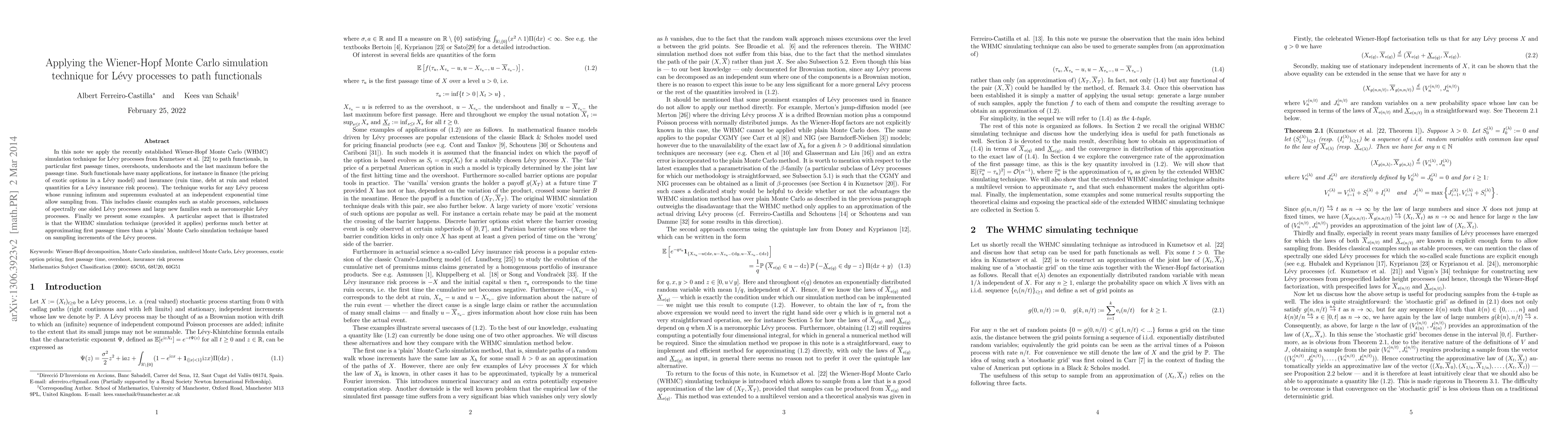 This paper applies the Wiener-Hopf Monte Carlo (WHMC) simulation technique to Levy processes for evaluating path functionals, including first passage times, overshoots, and undershoots. The WHMC method shows superior performance compared to traditional Monte Carlo methods, with applications in finance and insurance.