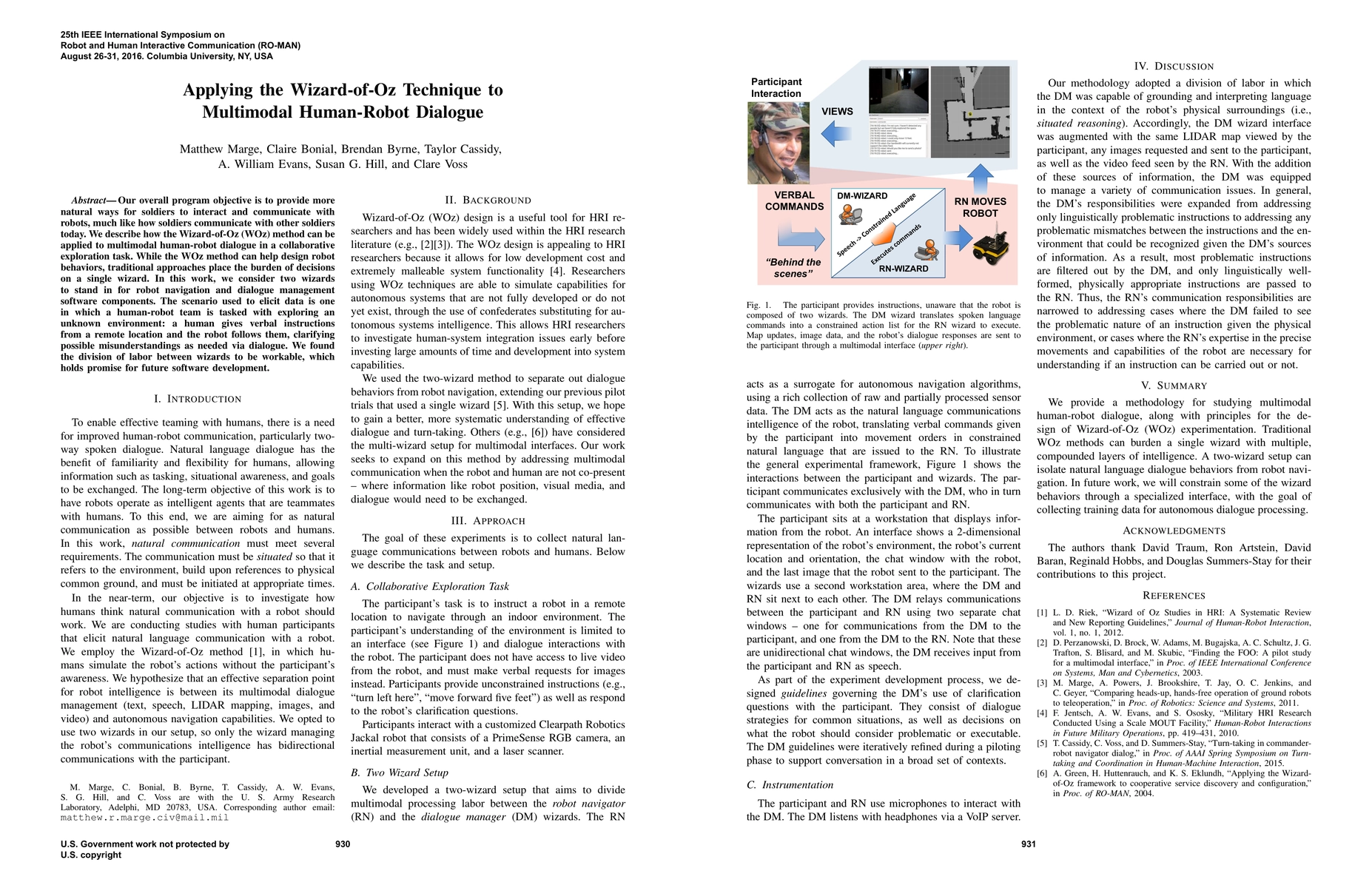 Our overall program objective is to provide more natural ways for soldiers to interact and communicate with robots, much like how soldiers communicate with other soldiers today. We describe how the Wizard-of-Oz (WOz) method can be applied to multimodal human-robot dialogue in a collaborative exploration task. While the WOz method can help design robot behaviors, traditional approaches place the burden of decisions on a single wizard. In this work, we consider two wizards to stand in for robot navigation and dialogue management software components. The scenario used to elicit data is one in which a human-robot team is tasked with exploring an unknown environment: a human gives verbal instructions from a remote location and the robot follows them, clarifying possible misunderstandings as needed via dialogue. We found the division of labor between wizards to be workable, which holds promise for future software development.