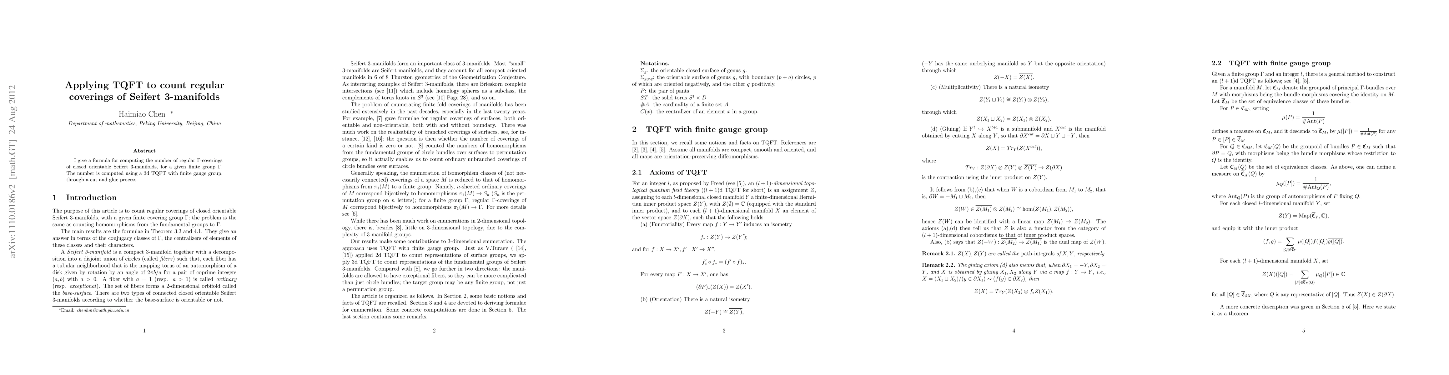This paper presents a formula for counting regular $\Gamma$-coverings of closed orientable Seifert 3-manifolds using a 3d topological quantum field theory (TQFT) with a finite gauge group, employing a cut-and-glue process for computation.