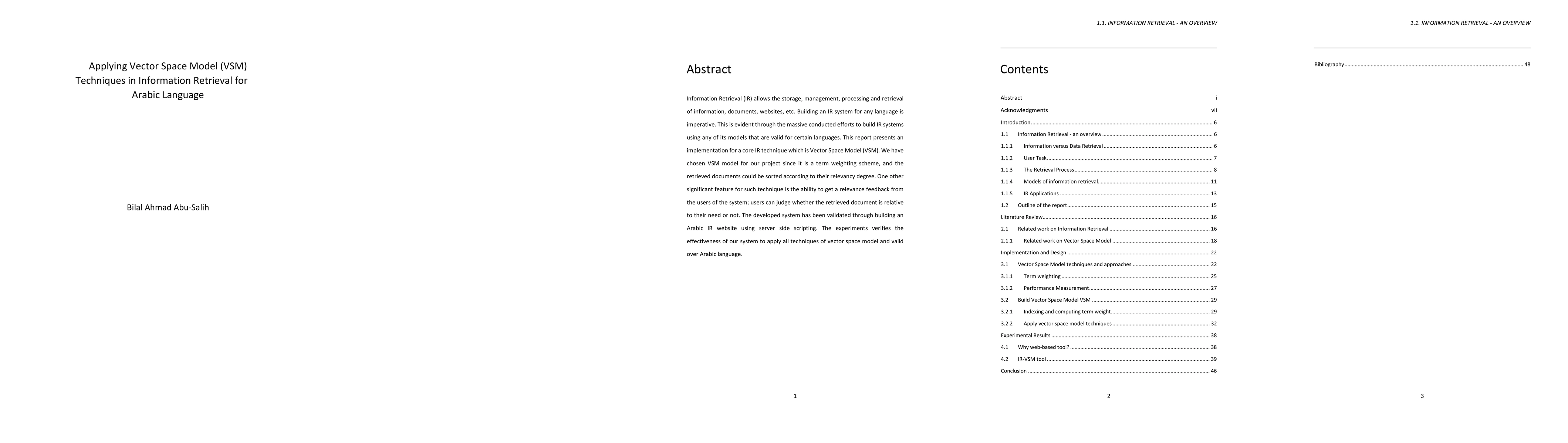This paper implements the Vector Space Model (VSM) for an Arabic Information Retrieval (IR) system, demonstrating its effectiveness in retrieving relevant documents and incorporating user relevance feedback. Experiments validate the system's performance in handling Arabic language documents.
