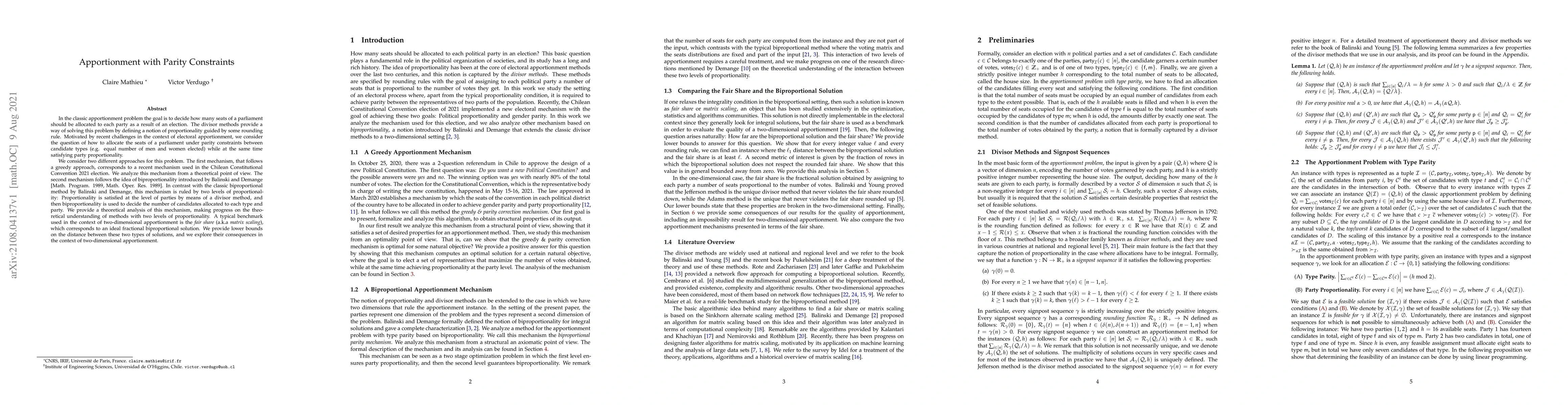 This paper explores apportionment methods with parity constraints, aiming to allocate parliament seats fairly while satisfying party proportionality, and proposes two mechanisms that achieve this goal, providing a theoretical analysis of their effectiveness.