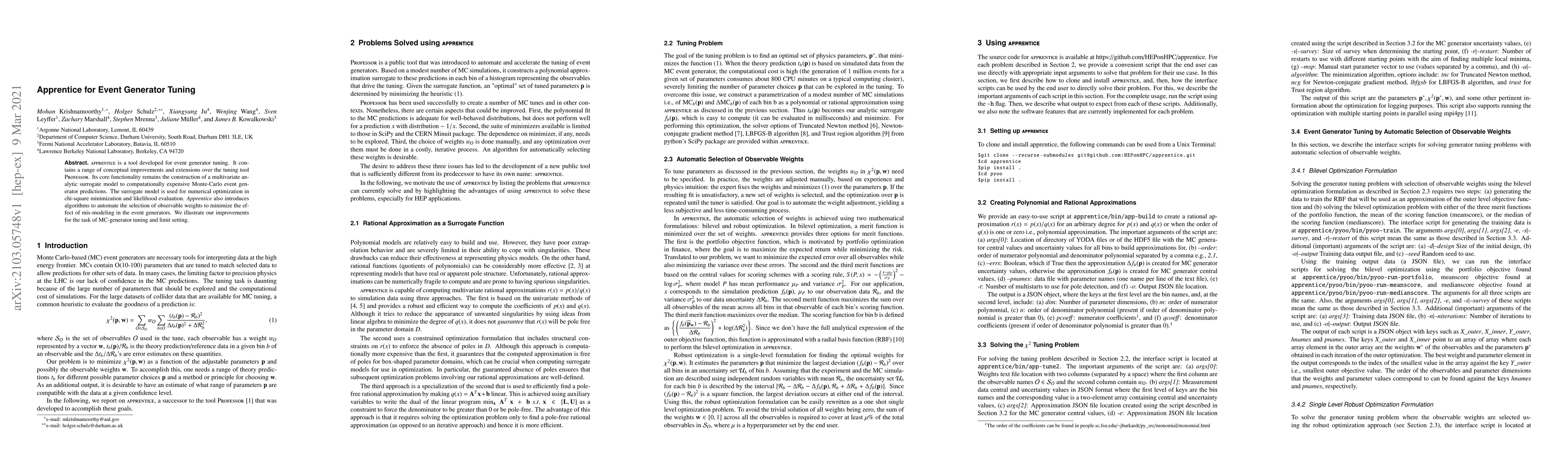 Apprentice is a tool developed for event generator tuning. It contains a range of conceptual improvements and extensions over the tuning tool Professor. Its core functionality remains the construction of a multivariate analytic surrogate model to computationally expensive Monte-Carlo event generator predictions. The surrogate model is used for numerical optimization in chi-square minimization and likelihood evaluation. Apprentice also introduces algorithms to automate the selection of observable weights to minimize the effect of mis-modeling in the event generators. We illustrate our improvements for the task of MC-generator tuning and limit setting.