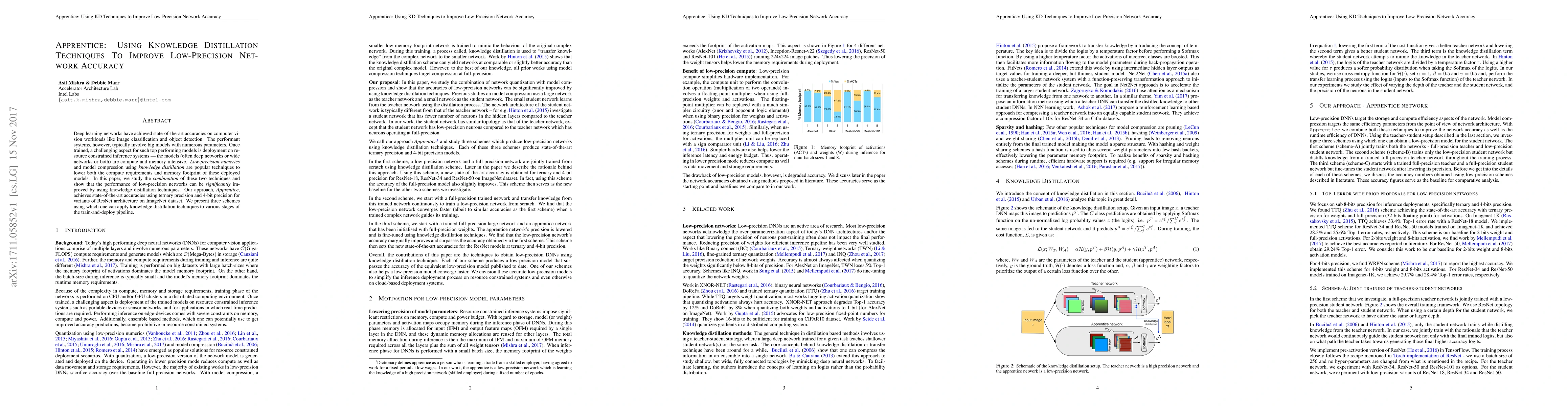 This paper explores the use of knowledge distillation techniques to enhance the accuracy of low-precision neural networks, achieving state-of-the-art results in ternary and 4-bit precision for ResNet architectures on ImageNet. The proposed method, Apprentice, demonstrates significant performance improvements through three distinct distillation schemes.