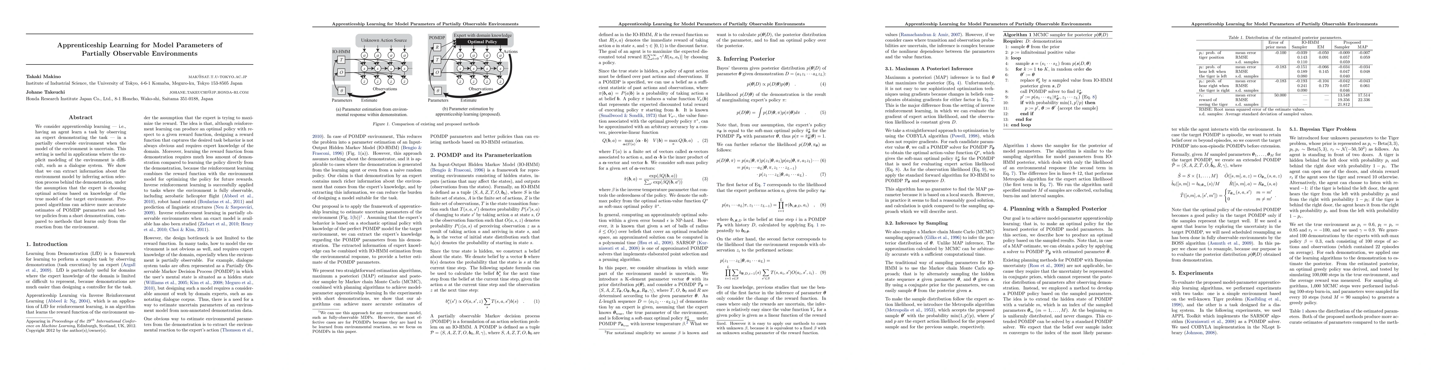 We consider apprenticeship learning, i.e., having an agent learn a task by observing an expert demonstrating the task in a partially observable environment when the model of the environment is uncertain. This setting is useful in applications where the explicit modeling of the environment is difficult, such as a dialogue system. We show that we can extract information about the environment model by inferring action selection process behind the demonstration, under the assumption that the expert is choosing optimal actions based on knowledge of the true model of the target environment. Proposed algorithms can achieve more accurate estimates of POMDP parameters and better policies from a short demonstration, compared to methods that learns only from the reaction from the environment.