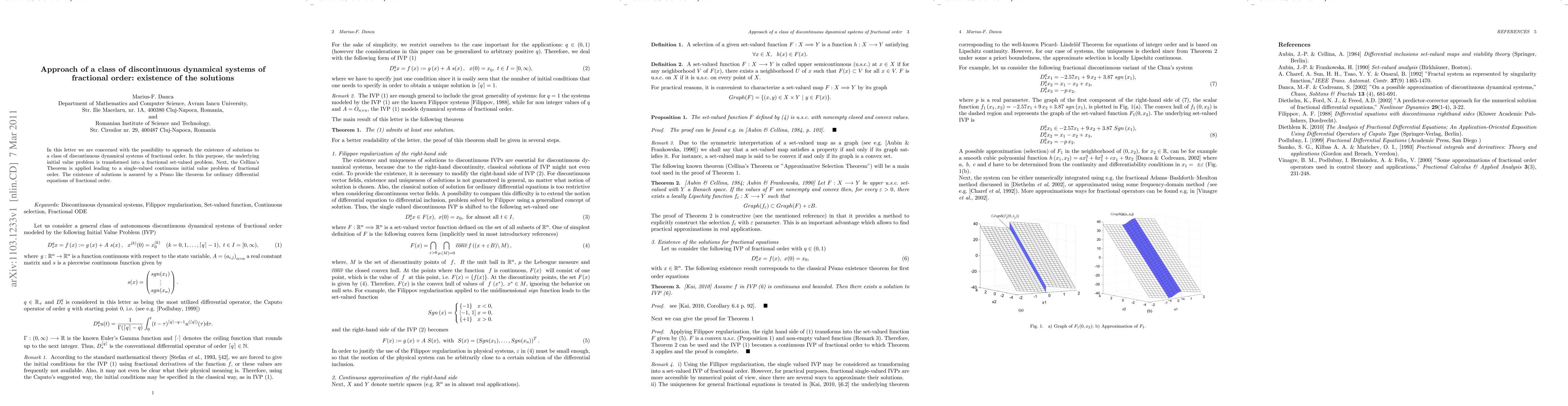 In this letter we are concerned with the possibility to approach the existence of solutions to a class of discontinuous dynamical systems of fractional order. In this purpose, the underlying initial value problem is transformed into a fractional set-valued problem. Next, the Cellina's Theorem is applied leading to a single-valued continuous initial value problem of fractional order. The existence of solutions is assured by a P\'{e}ano like theorem for ordinary differential equations of fractional order.