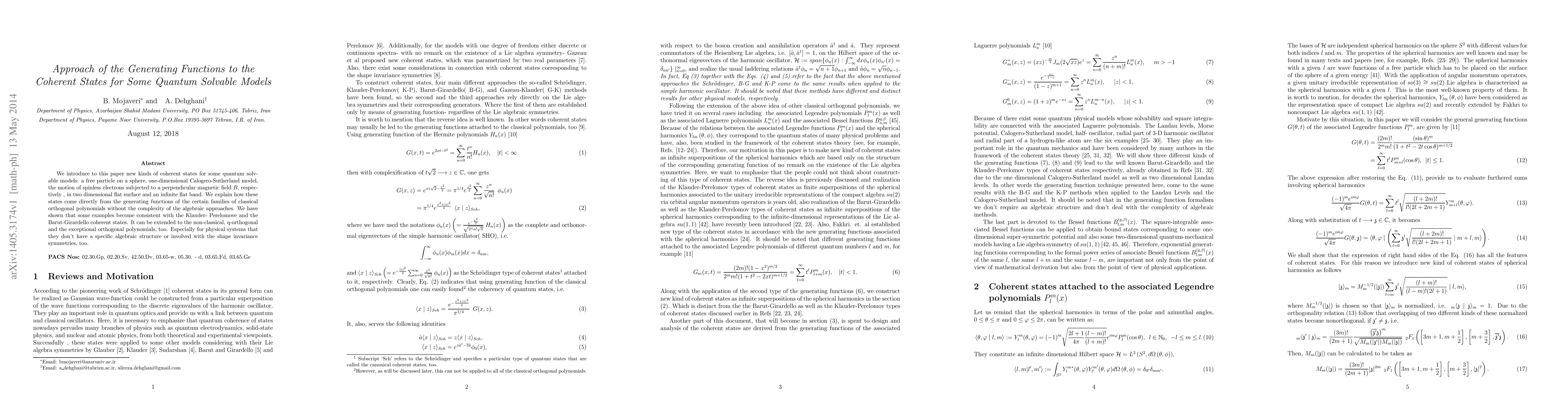 We introduce to this paper new kinds of coherent states for some quantum solvable models: a free particle on a sphere, one-dimensional Calogero-Sutherland model, the motion of spinless electrons subjected to a perpendicular magnetic field B, respectively, in two dimensional flat surface and an infinite flat band. We explain how these states come directly from the generating functions of the certain families of classical orthogonal polynomials without the complexity of the algebraic approaches. We have shown that some examples become consistent with the Klauder- Perelomove and the Barut-Girardello coherent states. It can be extended to the non-classical, q-orthogonal and the exceptional orthogonal polynomials, too. Especially for physical systems that they don't have a specific algebraic structure or involved with the shape invariance symmetries, too.