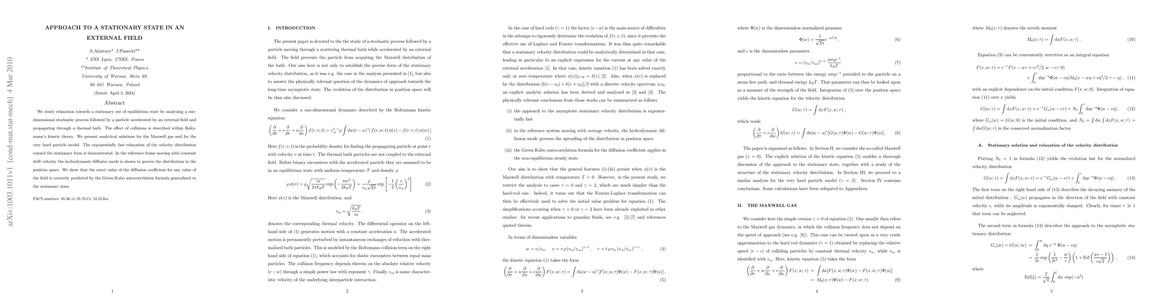 We study relaxation towards a stationary out of equilibrium state by analizing a one-dimensional stochastic process followed by a particle accelerated by an external field and propagating through a thermal bath. The effect of collisions is described within Botlzmann's kinetic theory. We present analytical solutions for the Maxwell gas and for the very hard particle model. The exponentially fast relaxation of the velocity distribution toward the stationary form is demonstrated. In the reference frame moving with constant drift velocity the hydrodynamic diffusive mode is shown to govern the distribution in the position space. We show that the exact value of the diffusion coefficient for any value of the field is correctly predicted by Green-Kubo autocorrelation formula generalized to the stationary state.