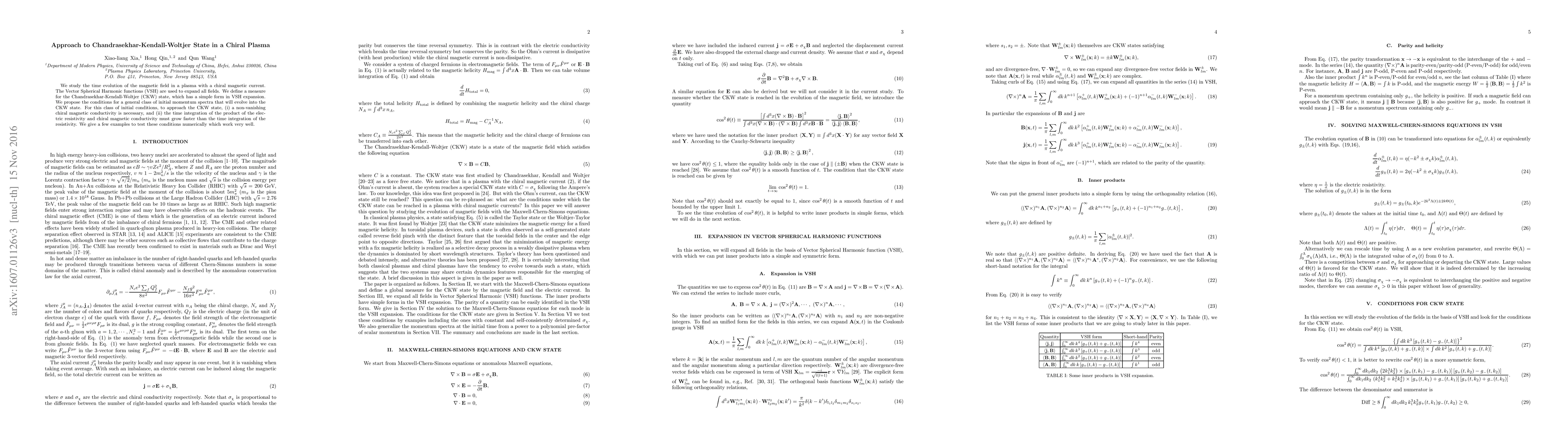 We study the time evolution of the magnetic field in a plasma with a chiral magnetic current. The Vector Spherical Harmonic functions (VSH) are used to expand all fields. We define a measure for the Chandrasekhar-Kendall-Woltjer (CKW) state, which has a simple form in VSH expansion. We propose the conditions for a general class of initial momentum spectra that will evolve into the CKW state. For this class of initial conditions, to approach the CKW state, (i) a non-vanishing chiral magnetic conductivity is necessary, and (ii) the time integration of the product of the electric resistivity and chiral magnetic conductivity must grow faster than the time integration of the resistivity. We give a few examples to test these conditions numerically which work very well.