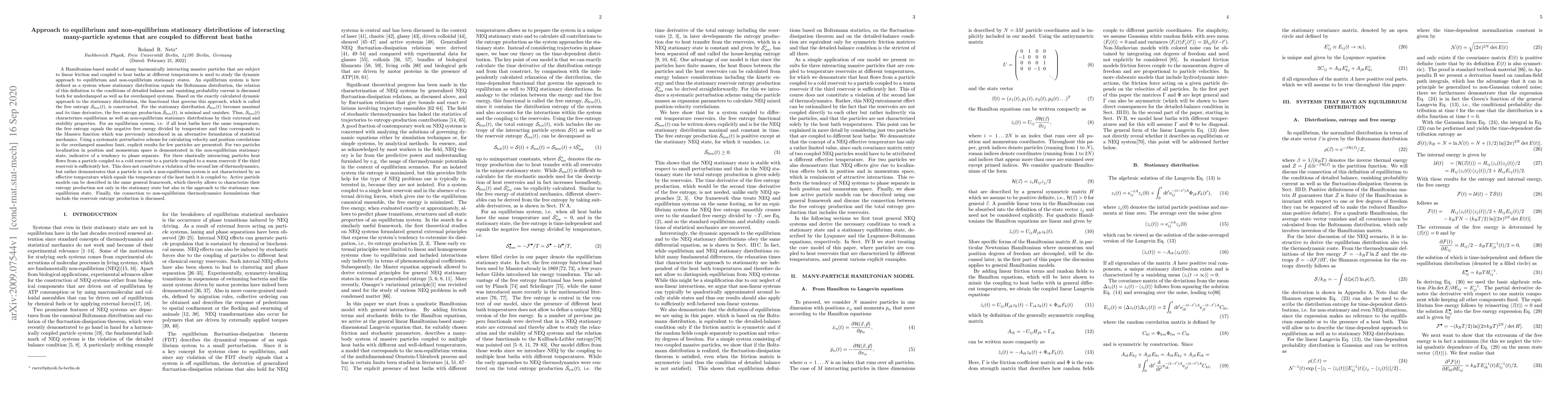 A Hamiltonian-based model of many harmonically interacting massive particles that are subject to linear friction and coupled to heat baths at different temperatures is used to study the dynamic approach to equilibrium and non-equilibrium stationary states. Based on the exactly calculated dynamic approach to the stationary distribution, the functional that governs this approach, which is called the free entropy, is constructed. For the stationary distribution the free entropy becomes maximal and its time derivative is minimal and vanishes. Thus, the free entropy characterizes equilibrium as well as non-equilibrium stationary distributions by their extremal and stability properties. For an equilibrium system, i.e. if all heat baths have the same temperature, the free entropy equals the negative free energy divided by temperature. Using a systematic perturbative scheme for calculating velocity and position correlations in the overdamped massless limit, explicit results for few particles are presented: For two particles localization in position and momentum space is demonstrated in the non-equilibrium stationary state, indicative of a tendency to phase separate. For three elastically interacting particles heat flows from a particle coupled to a cold reservoir to a particle coupled to a warm reservoir if the third reservoir is sufficiently hot. Active particle models can be described in the same general framework, which thereby allows to characterize their entropy production not only in the stationary state but also in the approach to the stationary non-equilibrium state. Finally, the connection to non-equilibrium thermodynamics formulations that include the reservoir entropy production is discussed.