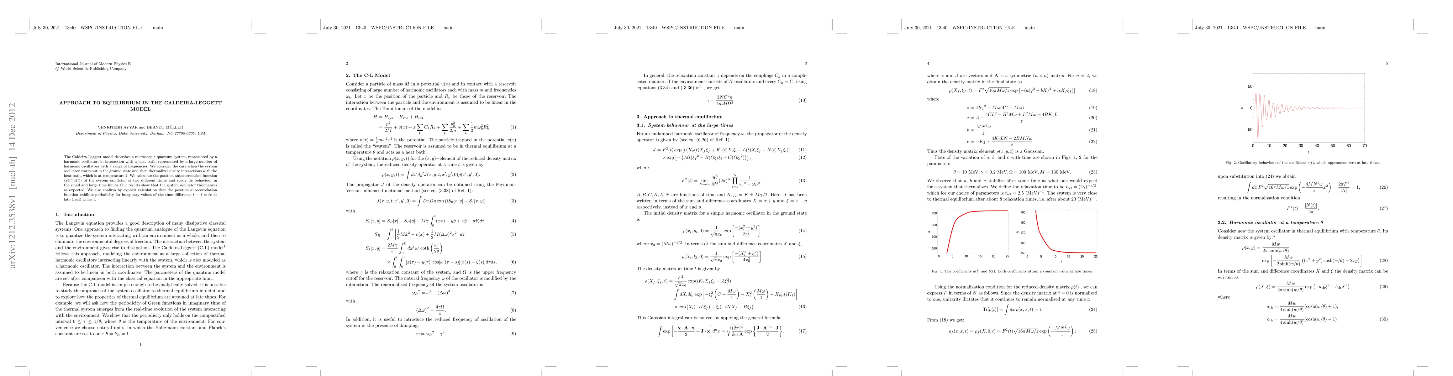 The Caldeira-Leggett model investigates a quantum harmonic oscillator's thermalization in a heat bath, revealing that the system oscillator thermalizes as expected. The position autocorrelation function shows periodicity for imaginary time differences, confirming the system's thermal behavior at late real times.