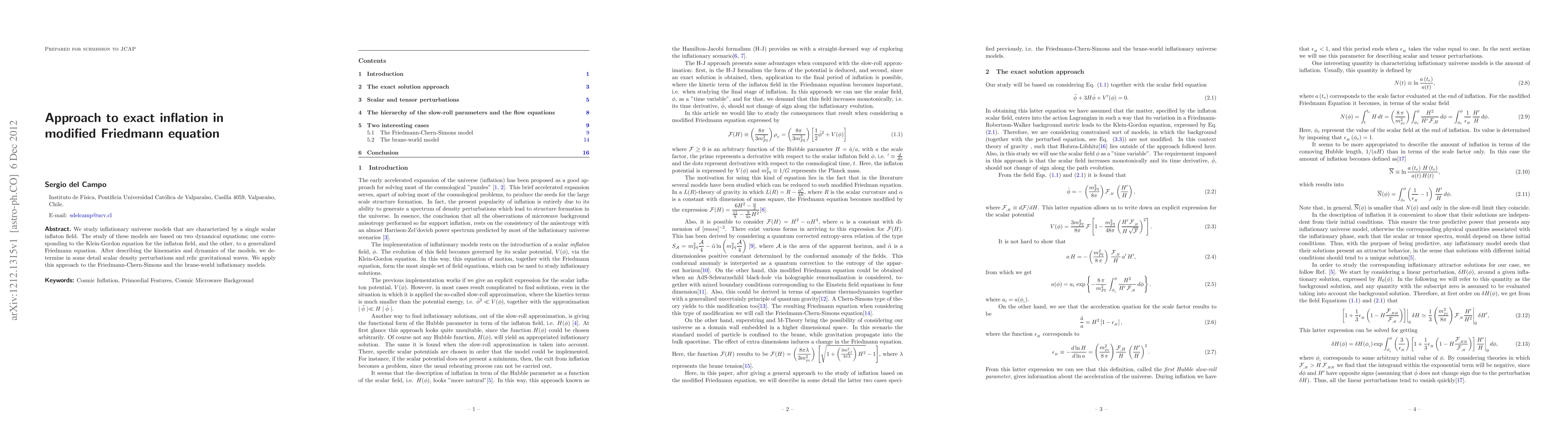We study inflationary universe models that are characterized by a single scalar inflaton field. The study of these models are based on two dynamical equations; one corresponding to the Klein-Gordon equation for the inflaton field, and the other, to a generalized Friedmann equation. After describing the kinematics and dynamics of the models, we determine in some detail scalar density perturbations and relic gravitational waves. We apply this approach to the Friedmann-Chern-Simons and the brane-world inflationary models.