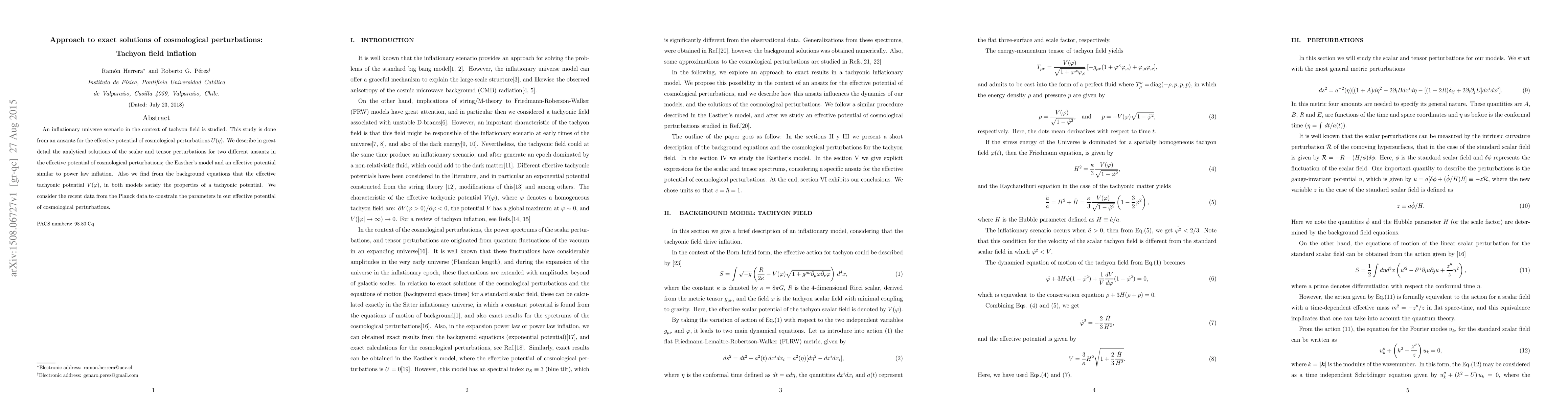 An inflationary universe scenario in the context of tachyon field is studied. This study is done from an ansantz for the effective potential of cosmological perturbations $U(\eta)$. We describe in great detail the analytical solutions of the scalar and tensor perturbations for two different ansantz in the effective potential of cosmological perturbations; the Easther's model and an effective potential similar to power law inflation. Also we find from the background equations that the effective tachyonic potential $V(\varphi)$, in both models satisfy the properties of a tachyonic potential. We consider the recent data from the Planck data to constrain the parameters in our effective potential of cosmological perturbations.