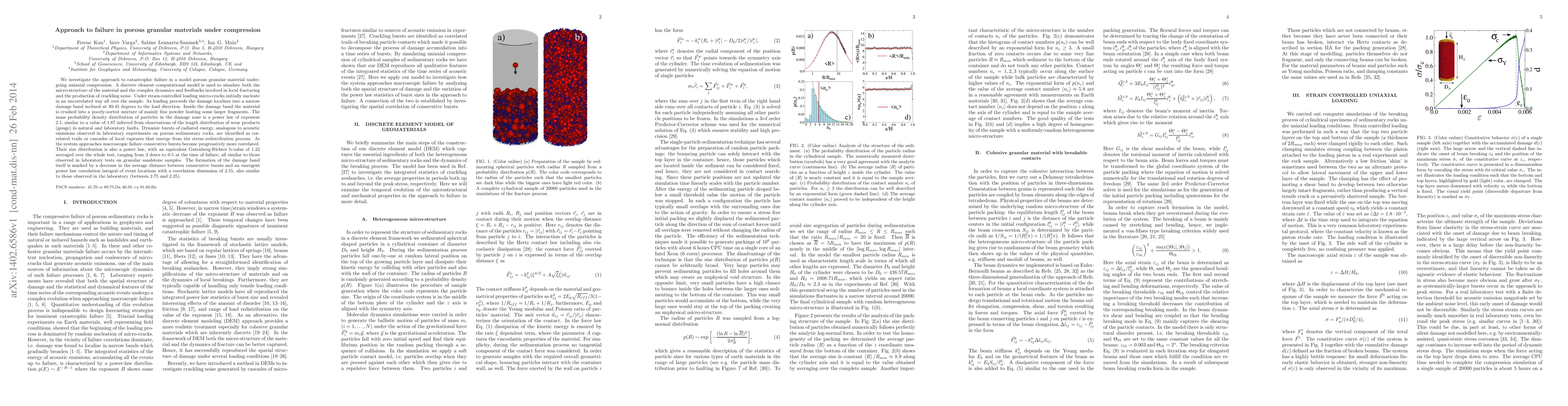 We investigate the approach to catastrophic failure in a model porous granular material undergoing uniaxial compression. A discrete element computational model is used to simulate both the micro-structure of the material and the complex dynamics and feedbacks involved in local fracturing and the production of crackling noise. Under strain-controlled loading micro-cracks initially nucleate in an uncorrelated way all over the sample. As loading proceeds the damage localizes into a narrow damage band inclined at 30-45 degrees to the load direction. Inside the damage band the material is crushed into a poorly-sorted mixture of mainly fine powder hosting some larger fragments. The mass probability density distribution of particles in the damage zone is a power law of exponent 2.1, similar to a value of 1.87 inferred from observations of the length distribution of wear products (gouge) in natural and laboratory faults. Dynamic bursts of radiated energy, analogous to acoustic emissions observed in laboratory experiments on porous sedimentary rocks, are identified as correlated trails or cascades of local ruptures that emerge from the stress redistribution process. As the system approaches macroscopic failure consecutive bursts become progressively more correlated. Their size distribution is also a power law, with an equivalent Gutenberg-Richter b-value of 1.22 averaged over the whole test, ranging from 3 down to 0.5 at the time of failure, all similar to those observed in laboratory tests on granular sandstone samples. The formation of the damage band itself is marked by a decrease in the average distance between consecutive bursts and an emergent power law correlation integral of event locations with a correlation dimension of 2.55, also similar to those observed in the laboratory (between 2.75 and 2.25).