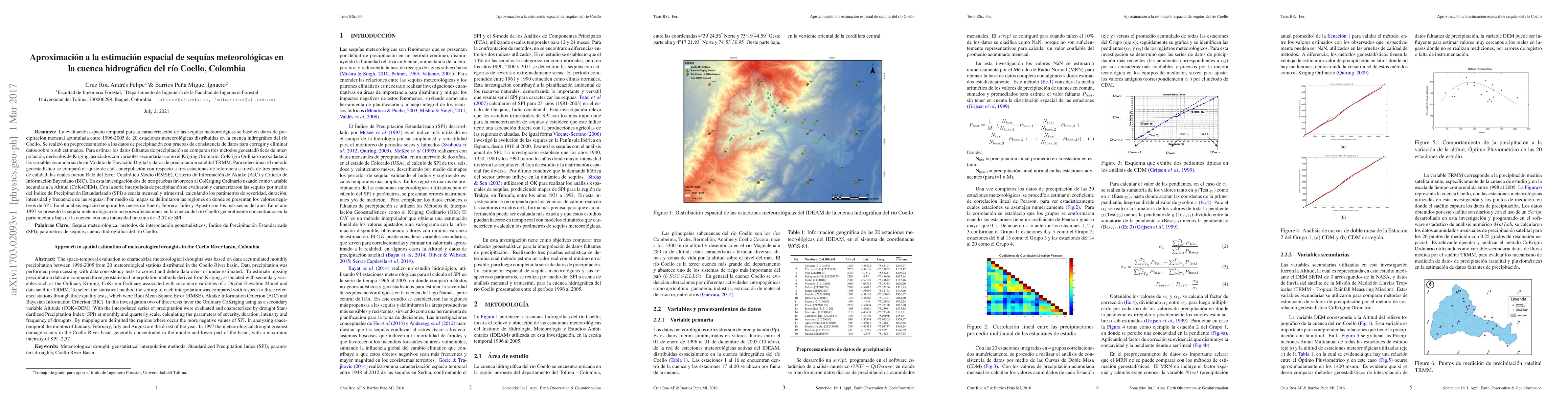 This study estimates meteorological droughts in Colombia's Coello River basin using spatial interpolation methods, finding that months July-August are driest and 1997 had the worst drought with maximum intensity of -2.57.