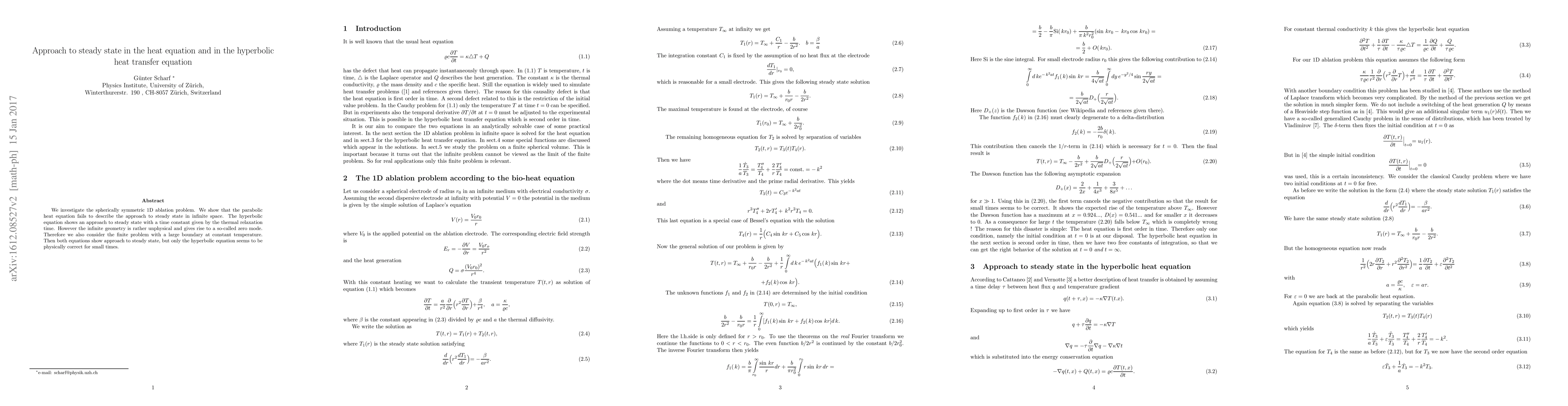 This research examines the 1D spherically symmetric ablation problem, finding that the parabolic heat equation isn't suitable for describing the approach to steady state in infinite space. The hyperbolic heat transfer equation, with a time constant as the thermal relaxation time, better represents this process but an infinite geometry causes a 'zero mode'. The study also considers a finite problem with a large boundary at constant temperature, where both equations show steady-state approach, though the hyperbolic equation appears more physically accurate for small times.