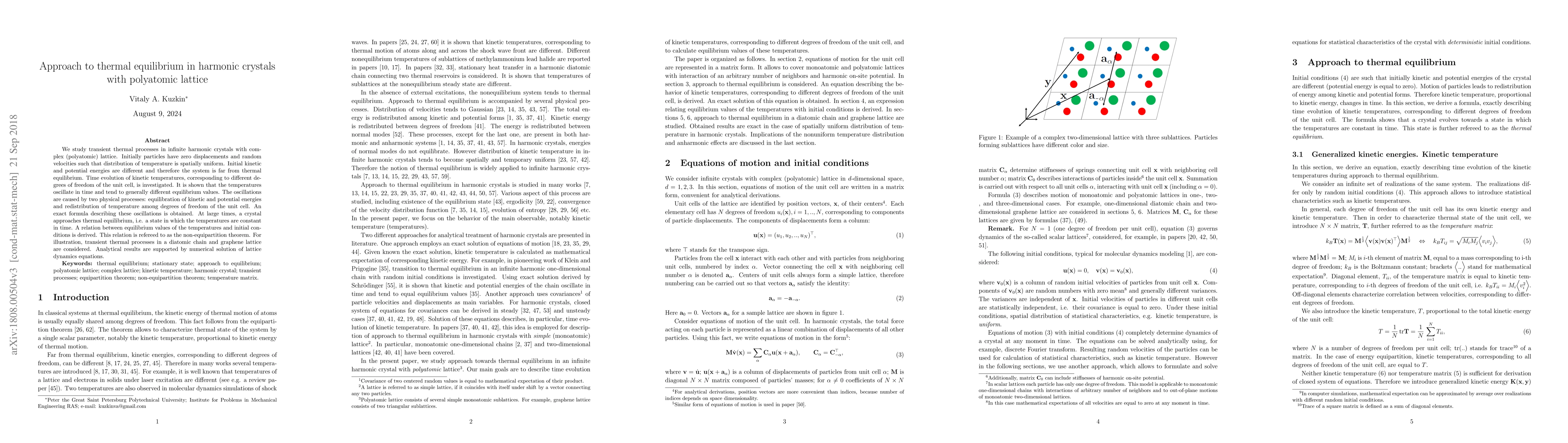 We study transient thermal processes in infinite harmonic crystals with complex (polyatomic) lattice. Initially particles have zero displacements and random velocities such that distribution of temperature is spatially uniform. Initial kinetic and potential energies are different and therefore the system is far from thermal equilibrium. Time evolution of kinetic temperatures, corresponding to different degrees of freedom of the unit cell, is investigated. It is shown that the temperatures oscillate in time and tend to generally different equilibrium values. The oscillations are caused by two physical processes: equilibration of kinetic and potential energies and redistribution of temperature among degrees of freedom of the unit cell. An exact formula describing these oscillations is obtained. At large times, a crystal approaches thermal equilibrium, i.e. a state in which the temperatures are constant in time. A relation between equilibrium values of the temperatures and initial conditions is derived. This relation is refereed to as the non-equipartition theorem. For illustration, transient thermal processes in a diatomic chain and graphene lattice are considered. Analytical results are supported by numerical solution of lattice dynamics equations. ${\bf Keywords}$: thermal equilibrium; stationary state; approach to equilibrium; polyatomic lattice; complex lattice; kinetic temperature; harmonic crystal; transient processes; equipartition theorem; temperature matrix.