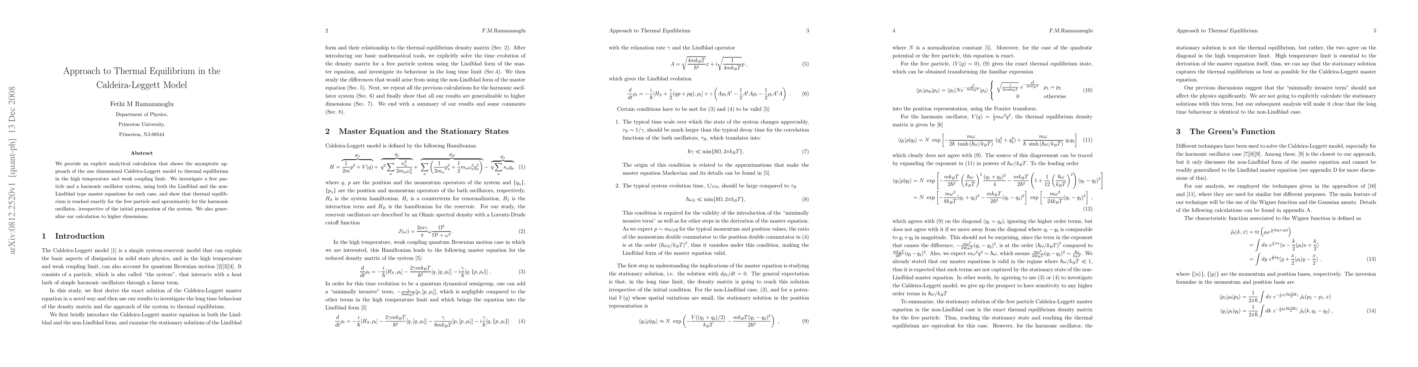 This paper analytically demonstrates the asymptotic approach to thermal equilibrium in the Caldeira-Leggett model for both free particles and harmonic oscillators under high-temperature and weak coupling conditions. It shows exact thermal equilibrium for free particles and approximate equilibrium for harmonic oscillators, using both Lindblad and non-Lindblad master equations.