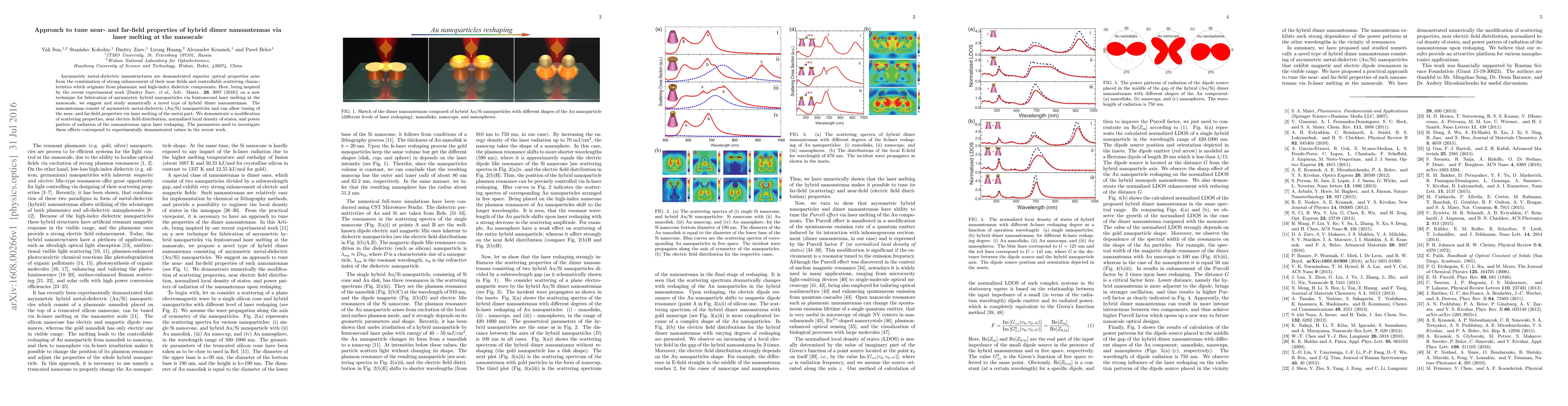 Asymmetric metal-dielectric nanostructures are demonstrated superior optical properties arise from the combination of strong enhancement of their near fields and controllable scattering characteristics which originate from plasmonic and high-index dielectric components. Here, being inspired by the recent experimental work [Dmitry~Zuev, \textit{et al.}, Adv. Mater. \textbf{28}, 3087 (2016)] on a new technique for fabrication of asymmetric hybrid nanoparticles via femtosecond laser melting at the nanoscale, we suggest and study numerically a novel type of hybrid dimer nanoantennas. The nanoantennas consist of asymmetric metal-dielectric (Au/Si) nanoparticles and can allow tuning of the near- and far-field properties via laser melting of the metal part. We demonstrate a modification of scattering properties, near electric field distribution, normalized local density of states, and power patters of radiation of the nanoantennas upon laser reshaping. The parameters used to investigate these effects correspond to experimentally demonstrated values in the recent work.