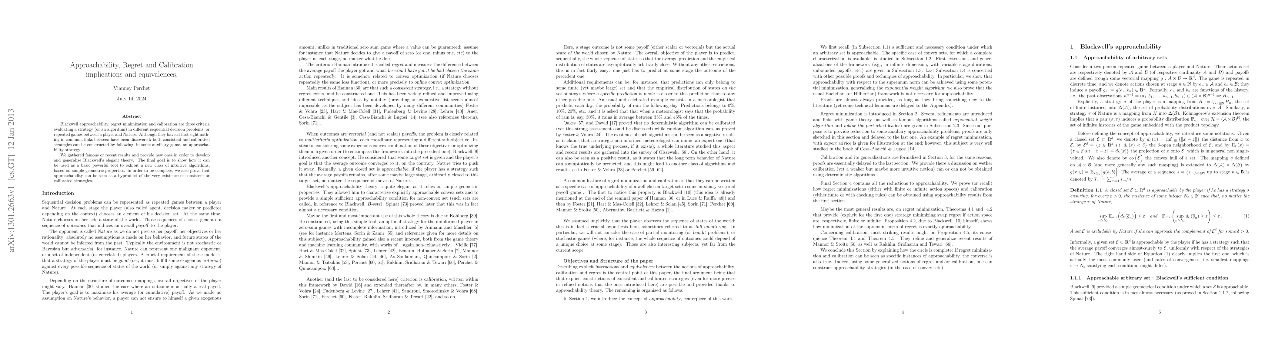 The paper establishes connections between approachability, regret minimization, and calibration, providing new theoretical insights and algorithmic constructions.