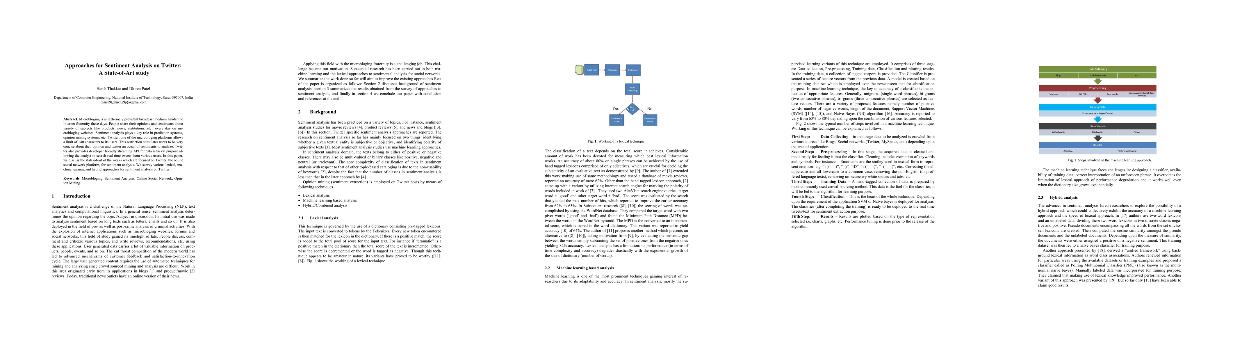 This paper surveys state-of-the-art methods for sentiment analysis on Twitter, focusing on lexical, machine learning, and hybrid approaches. It highlights the unique challenges posed by Twitter's character limit and real-time data streaming.