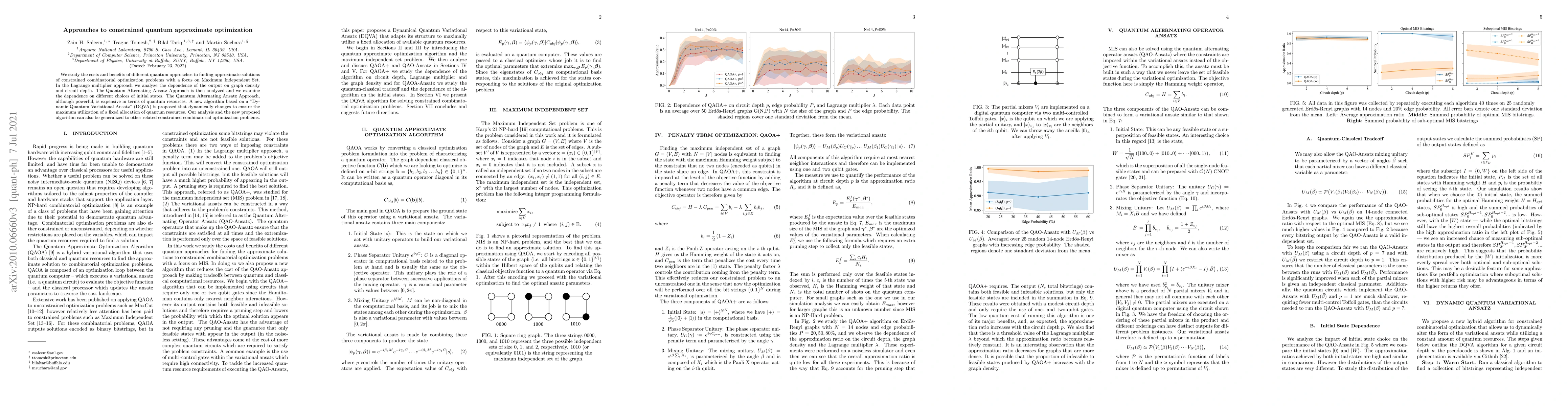 We study the costs and benefits of different quantum approaches to finding approximate solutions of constrained combinatorial optimization problems with a focus on Maximum Independent Set. In the Lagrange multiplier approach we analyze the dependence of the output on graph density and circuit depth. The Quantum Alternating Ansatz Approach is then analyzed and we examine the dependence on different choices of initial states. The Quantum Alternating Ansatz Approach, although powerful, is expensive in terms of quantum resources. A new algorithm based on a "Dynamic Quantum Variational Ansatz" (DQVA) is proposed that dynamically changes to ensure the maximum utilization of a fixed allocation of quantum resources. Our analysis and the new proposed algorithm can also be generalized to other related constrained combinatorial optimization problems.