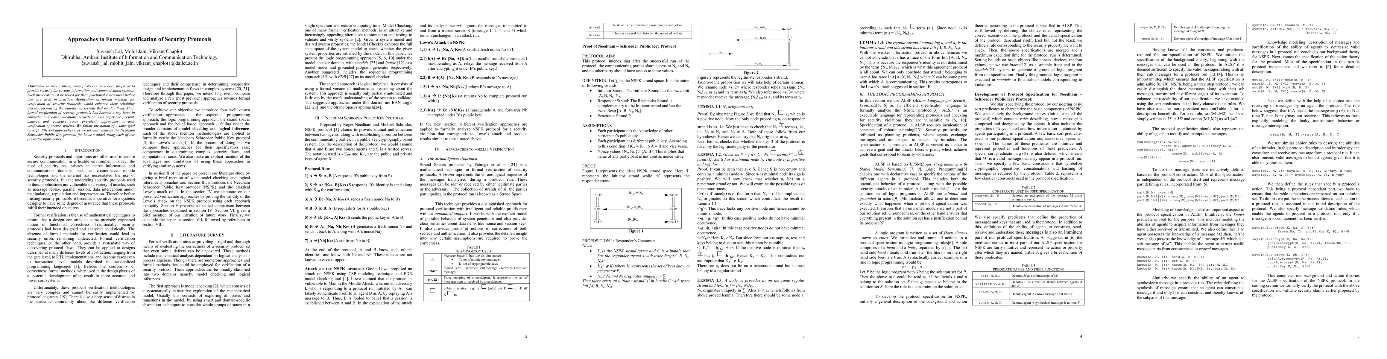 This paper presents, analyzes, and compares various formal verification approaches for security protocols, emphasizing their reliability and usability in secure systems. It specifically applies these methods to analyze the Needham Schroeder Public Key protocol for Lowe's attack.