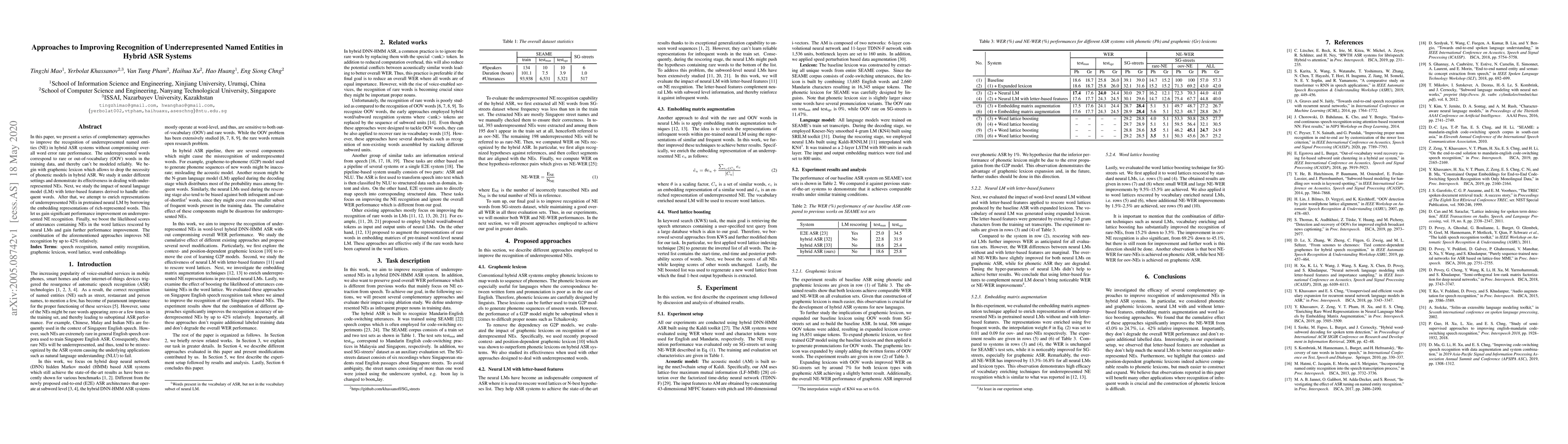 In this paper, we present a series of complementary approaches to improve the recognition of underrepresented named entities (NE) in hybrid ASR systems without compromising overall word error rate performance. The underrepresented words correspond to rare or out-of-vocabulary (OOV) words in the training data, and thereby can't be modeled reliably. We begin with graphemic lexicon which allows to drop the necessity of phonetic models in hybrid ASR. We study it under different settings and demonstrate its effectiveness in dealing with underrepresented NEs. Next, we study the impact of neural language model (LM) with letter-based features derived to handle infrequent words. After that, we attempt to enrich representations of underrepresented NEs in pretrained neural LM by borrowing the embedding representations of rich-represented words. This let us gain significant performance improvement on underrepresented NE recognition. Finally, we boost the likelihood scores of utterances containing NEs in the word lattices rescored by neural LMs and gain further performance improvement. The combination of the aforementioned approaches improves NE recognition by up to 42% relatively.