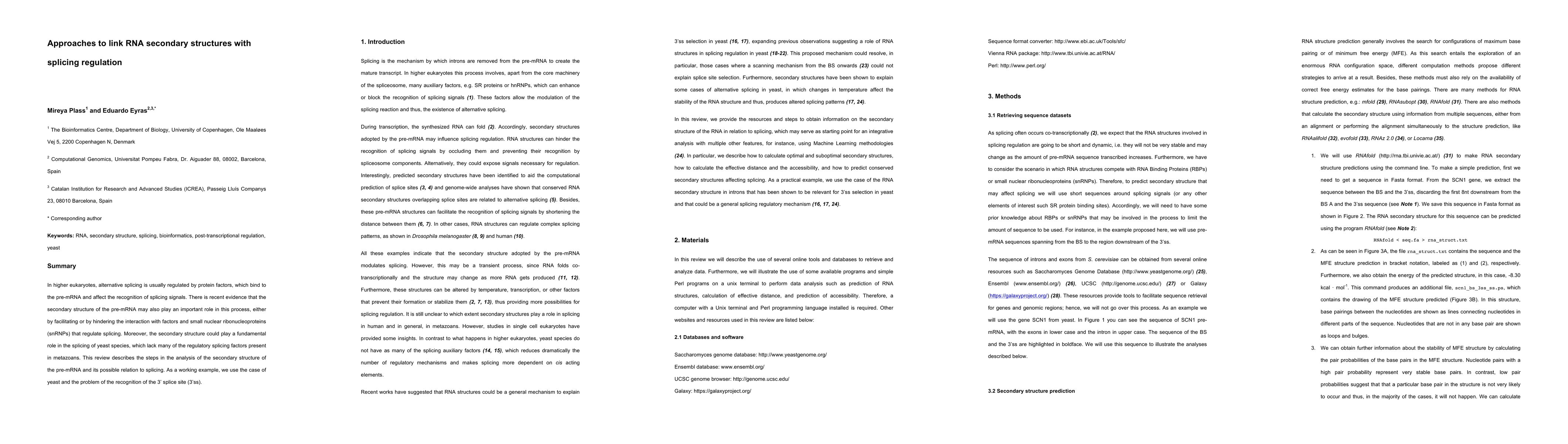 In higher eukaryotes, alternative splicing is usually regulated by protein factors, which bind to the pre-mRNA and affect the recognition of splicing signals. There is recent evidence that the secondary structure of the pre-mRNA may also play an important role in this process, either by facilitating or by hindering the interaction with factors and small nuclear ribonucleoproteins (snRNPs) that regulate splicing. Moreover, the secondary structure could play a fundamental role in the splicing of yeast species, which lack many of the regulatory splicing factors present in metazoans. This review describes the steps in the analysis of the secondary structure of the pre-mRNA and its possible relation to splicing. As a working example, we use the case of yeast and the problem of the recognition of the 3-prime splice site.
